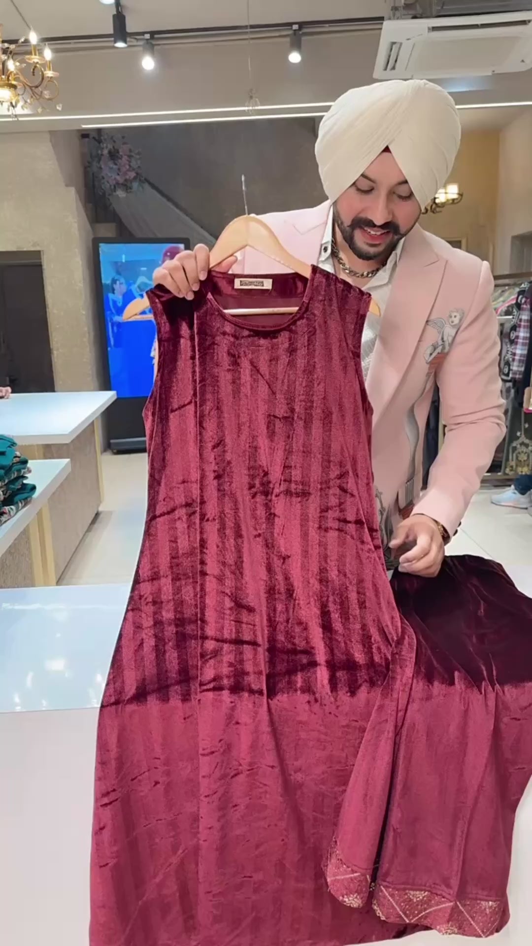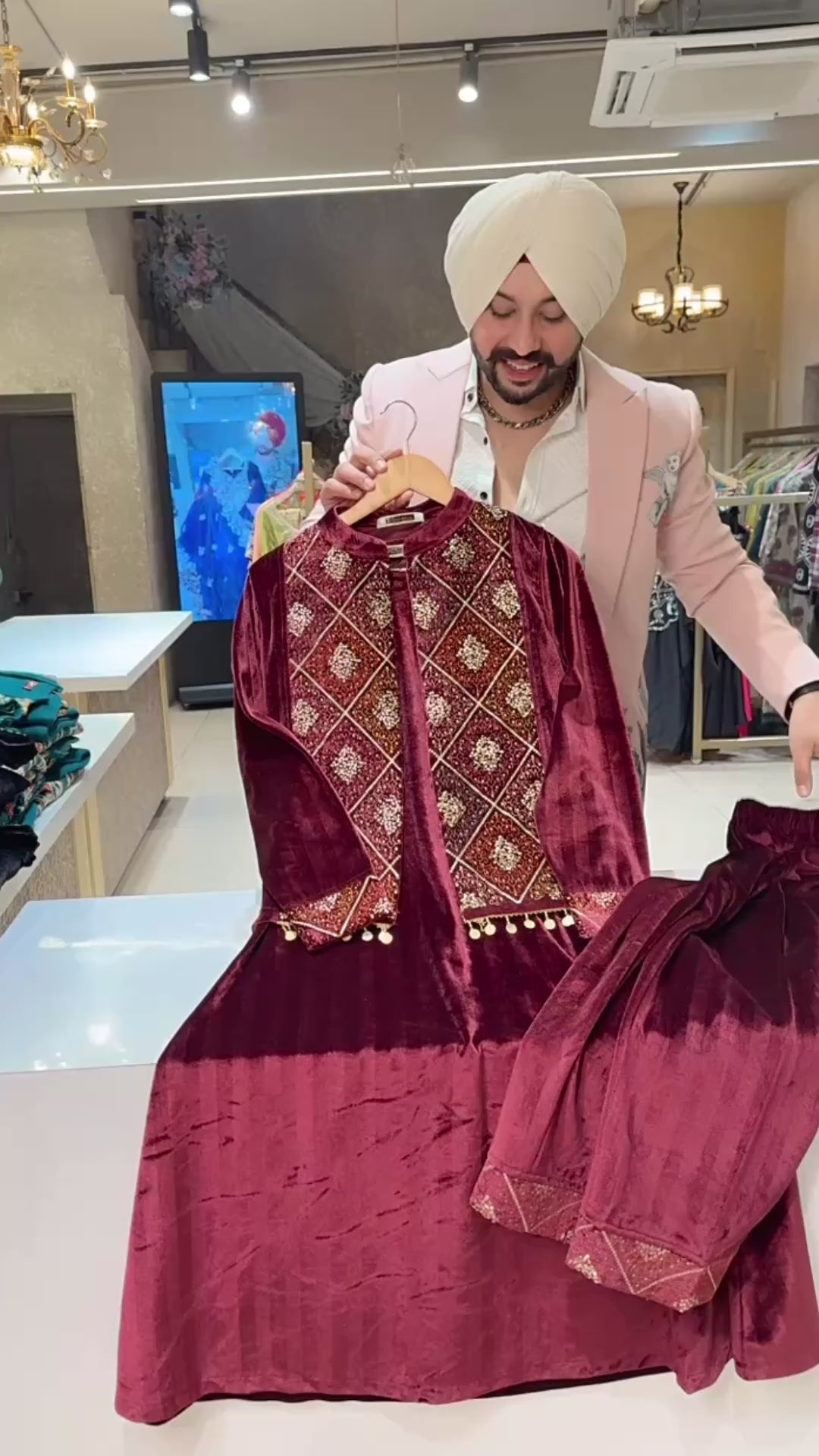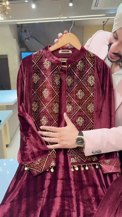 Maroon Velvet long Length A-line Coord set with Heavy embroidered & sequins Work Short Jacket