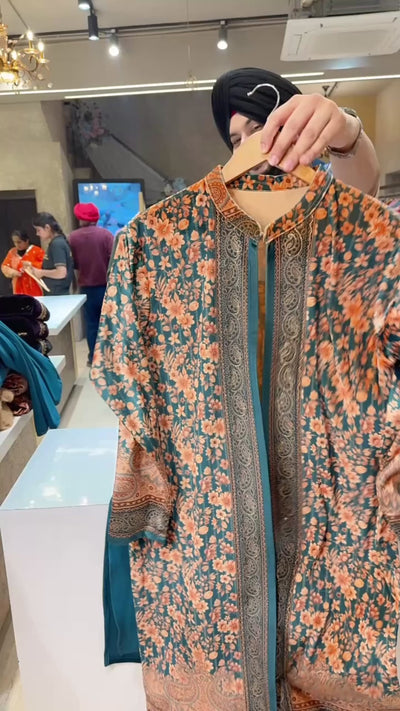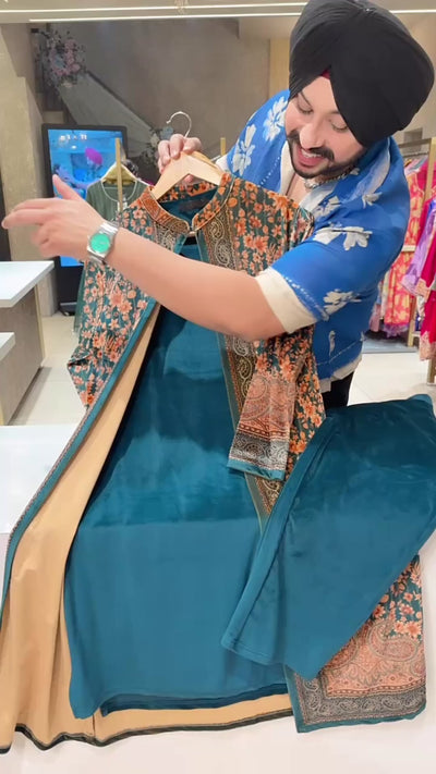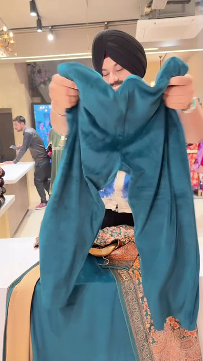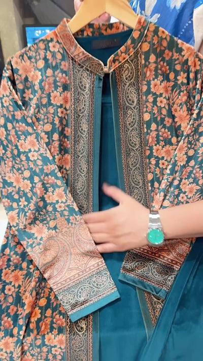 Peacock Stretchable Velvet long Length Coord set with Stylish Velvet Shrug