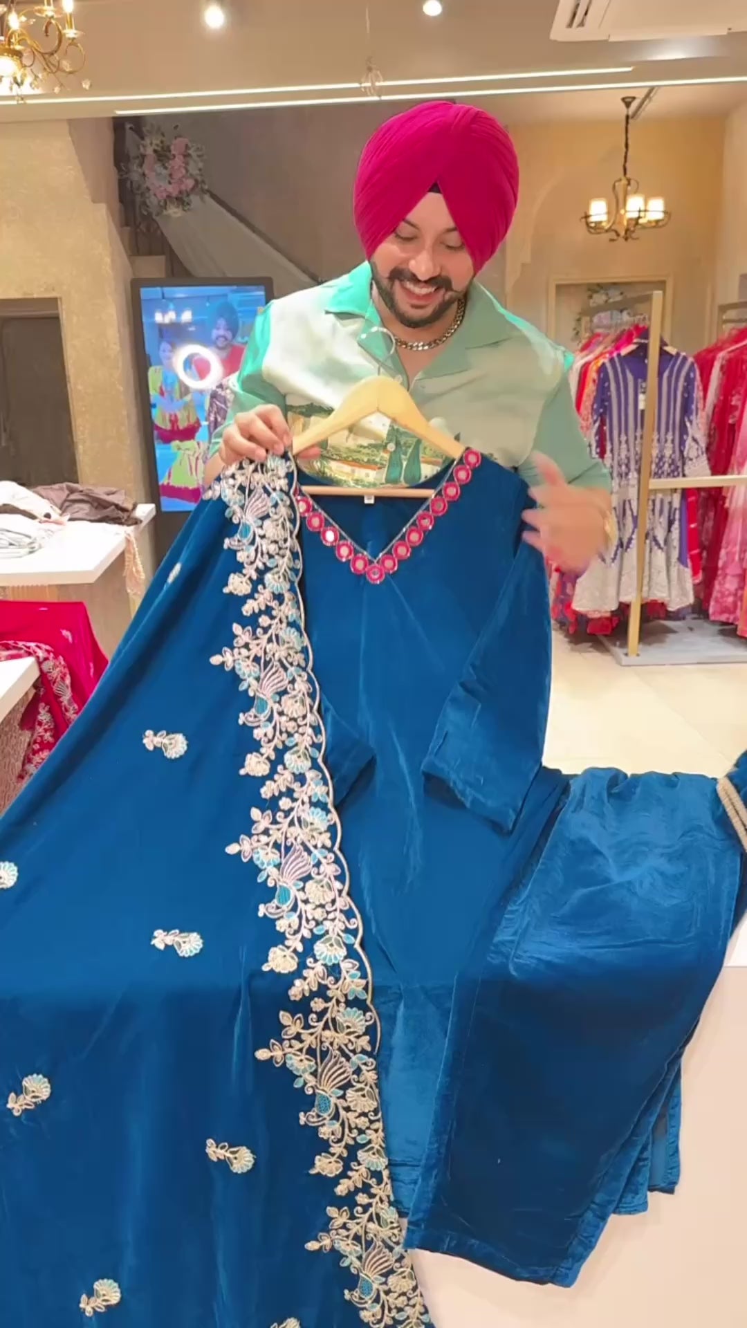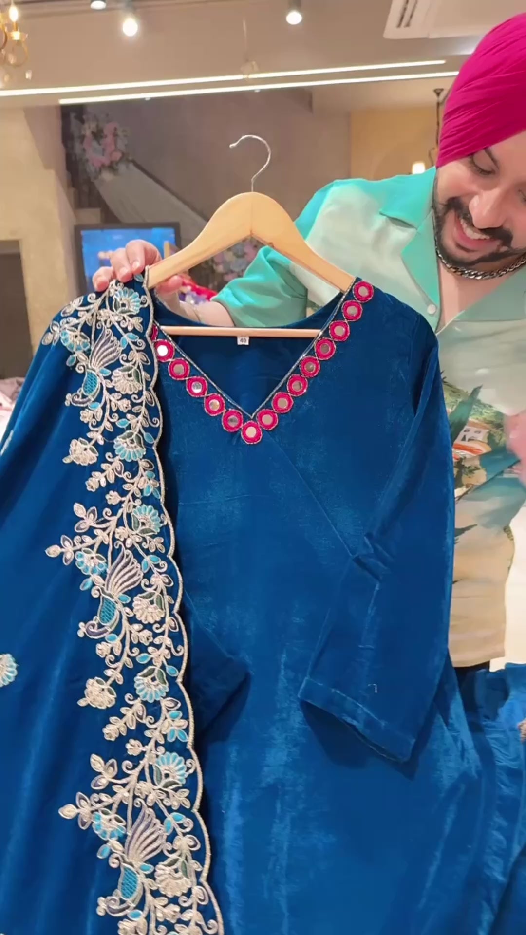 Teel Blue Velvet Party Wear Suit with Hwavy embroidered Duppata & Cute Potli