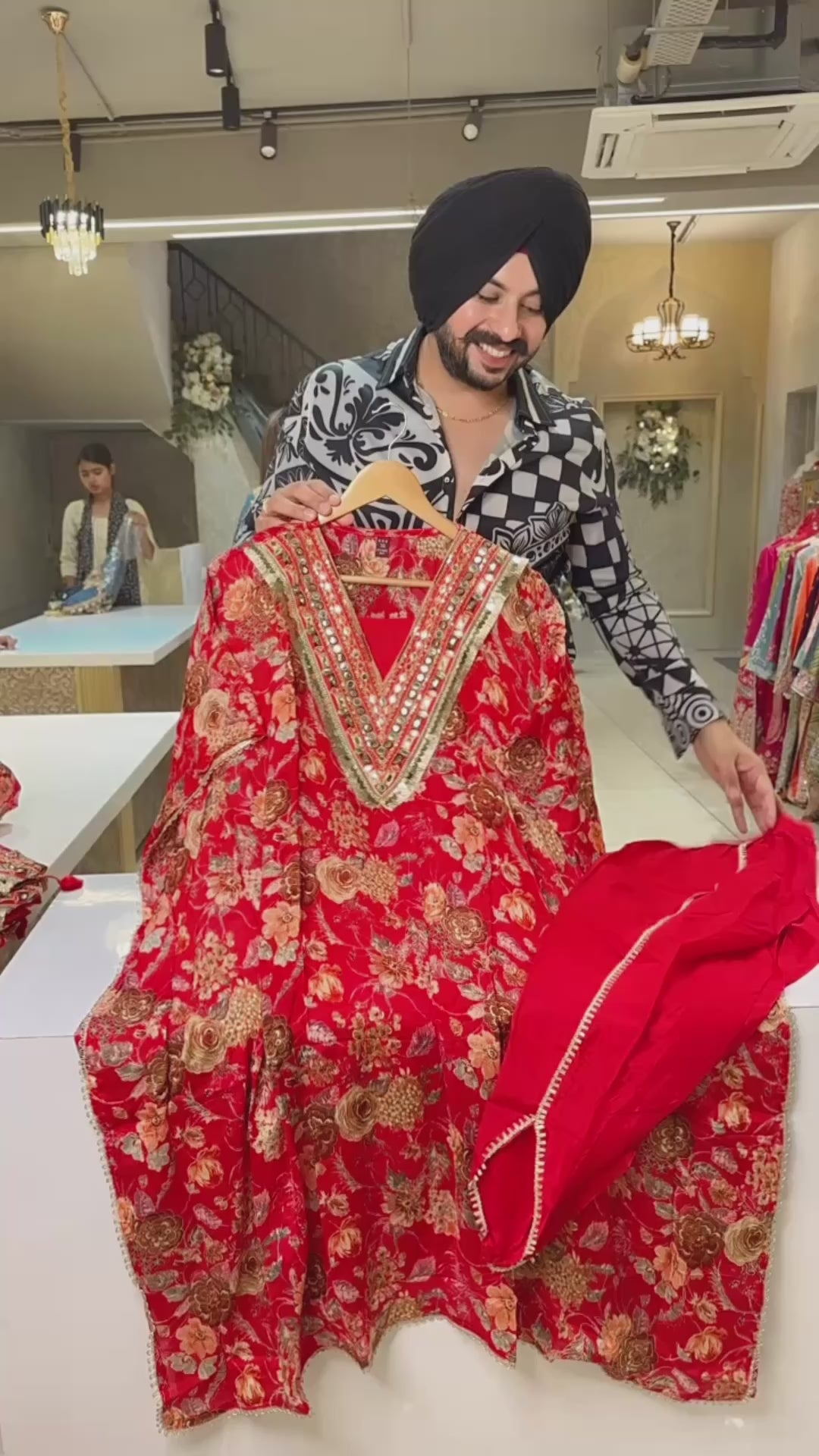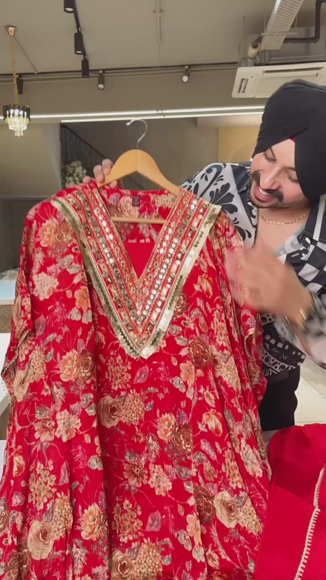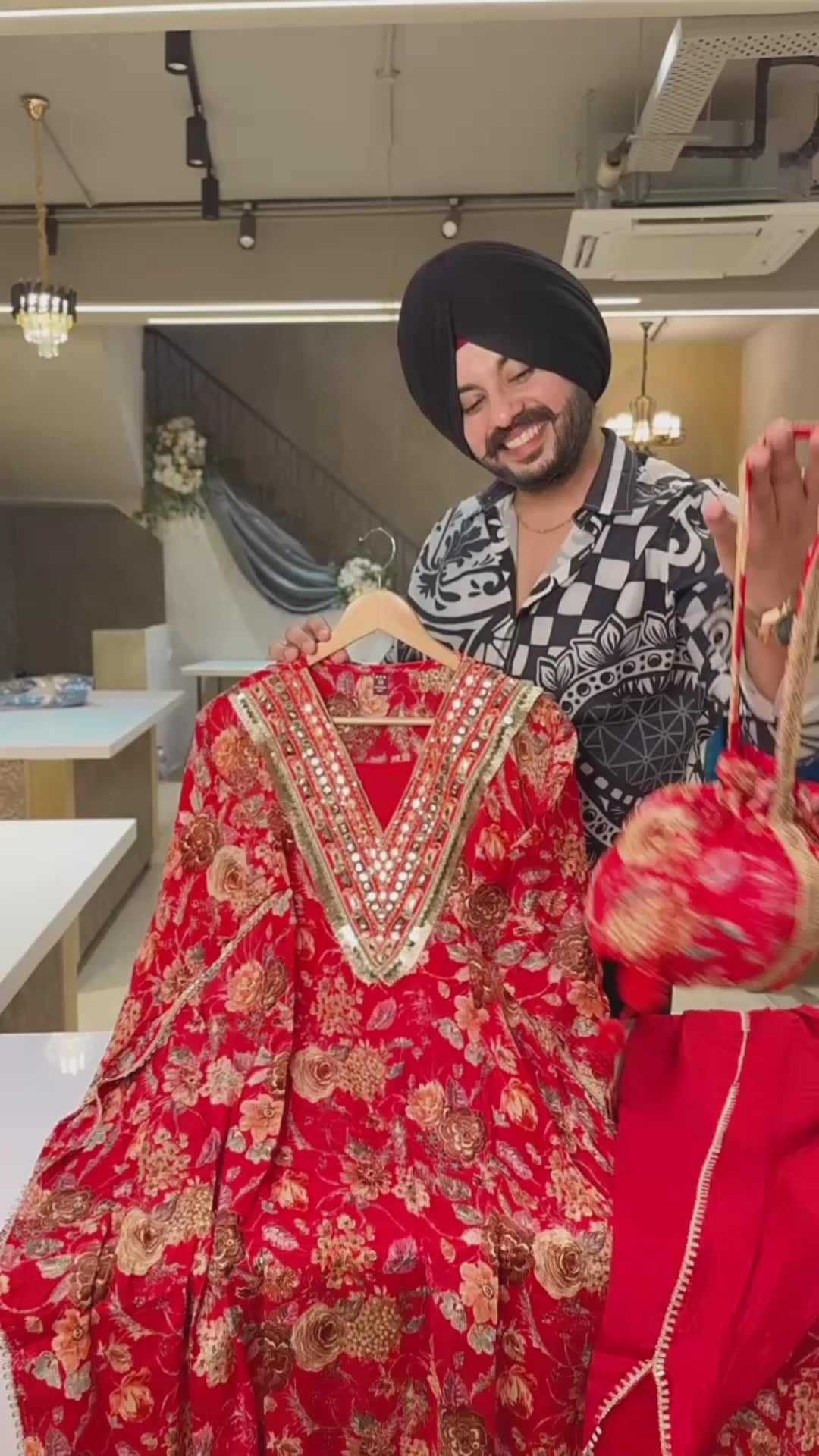 Vibrant Red Chinon Floral Print Kaftan Coord Set with Tulip pants & cute Potli