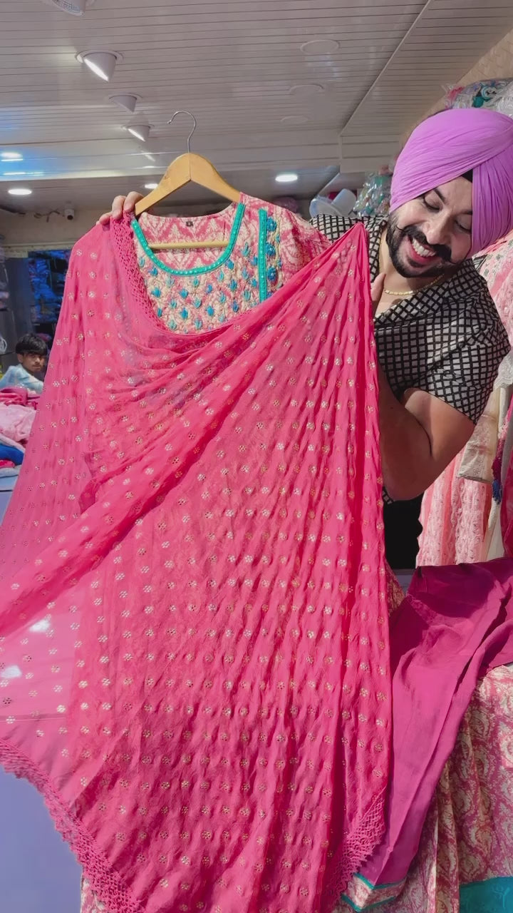 Pink Muslin silk Anarkali Suit with Beautiful handwork on neck & Mukash Duppata