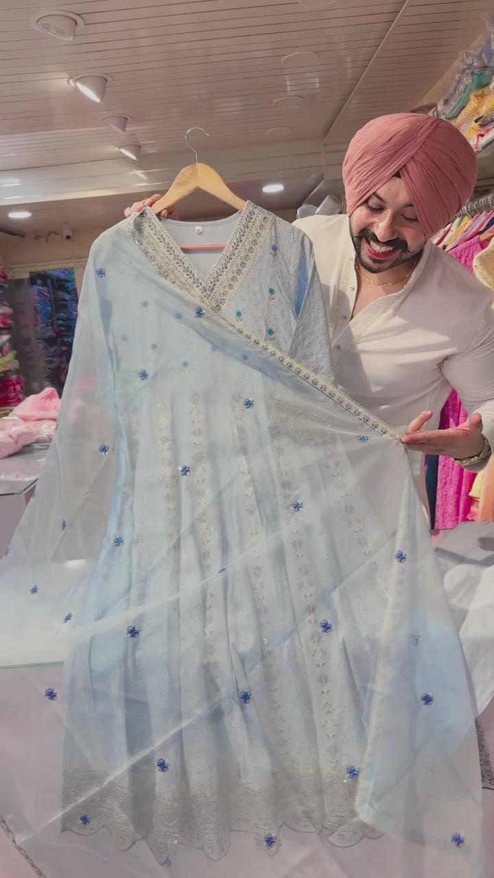 Light blue V-neck embroidered Anarkali suit with Beautiful Organza Duppata