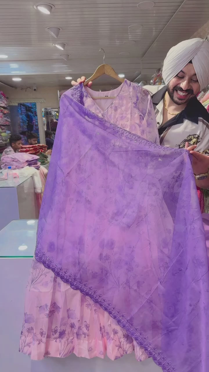 Light pink & purple organza Girlish Anarkali Suit with Embroidered Duppata
