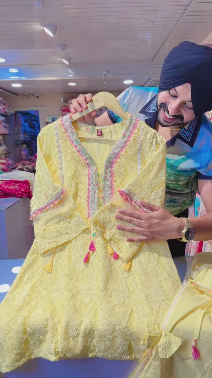Lemon Yellow Crochet C-cut Coord set with Cute Potli & Stylish Plazo