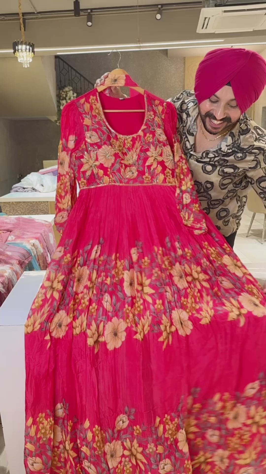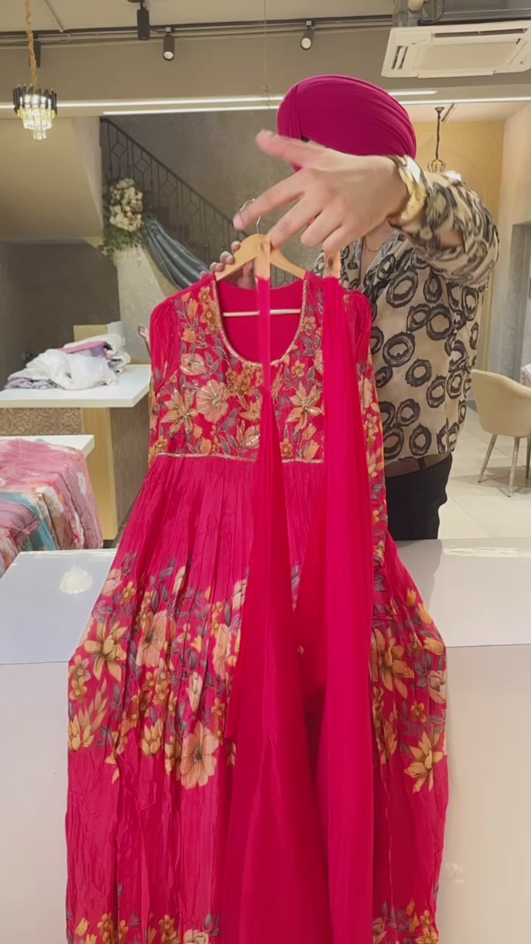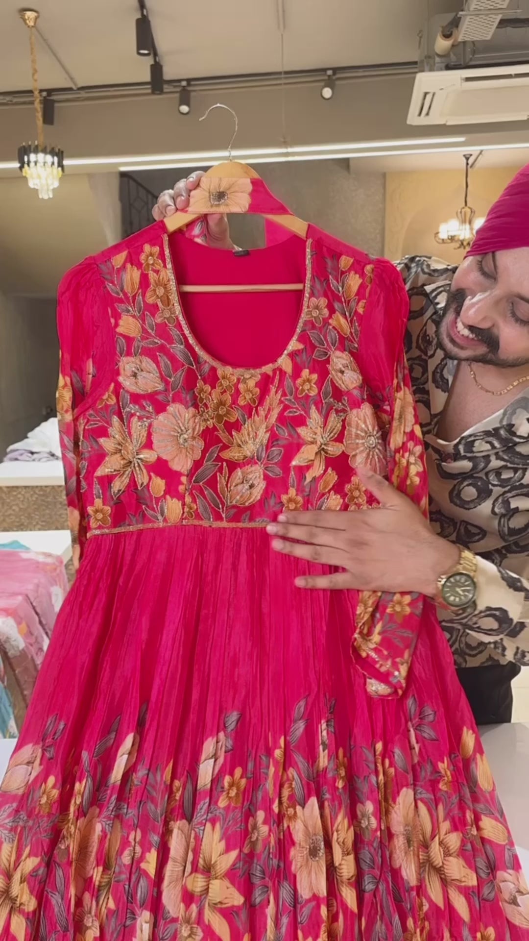 Rani pink Georgette Hand Embroidered Floral Print Anarkali Gown with Sleek Neck Stawl