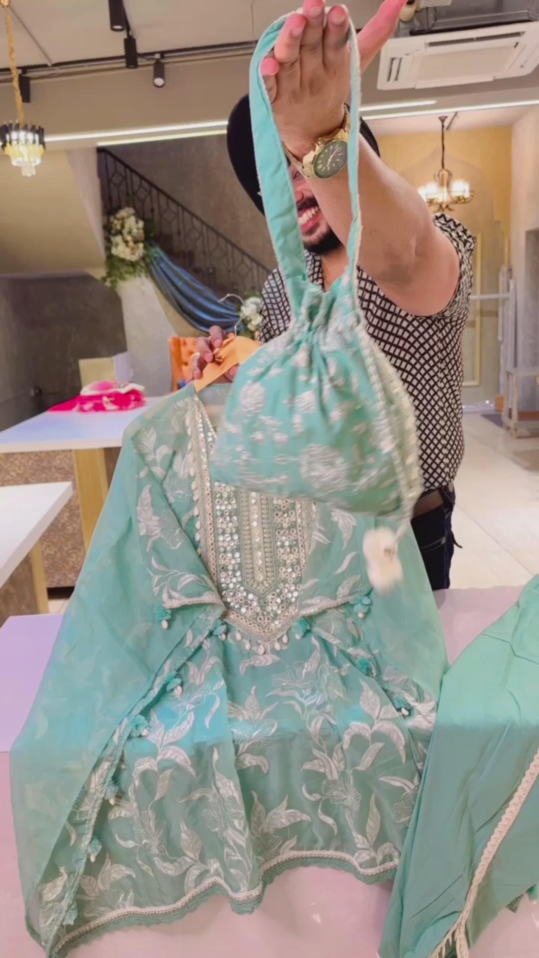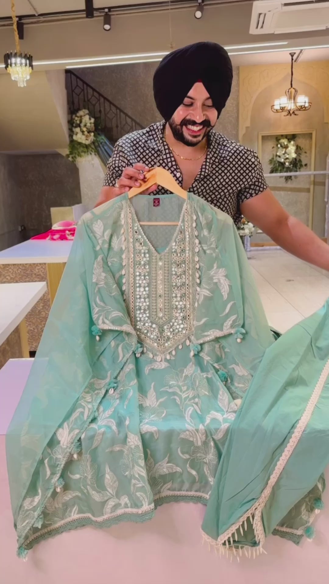Sea green organza Fully embroidered Kaftan Coord set with tulip pants & cute Potli