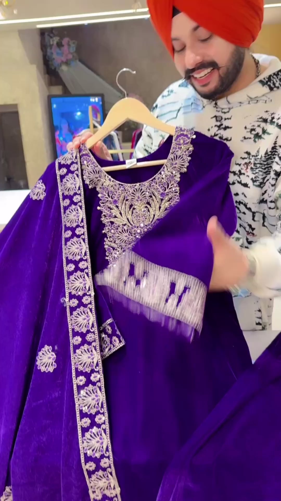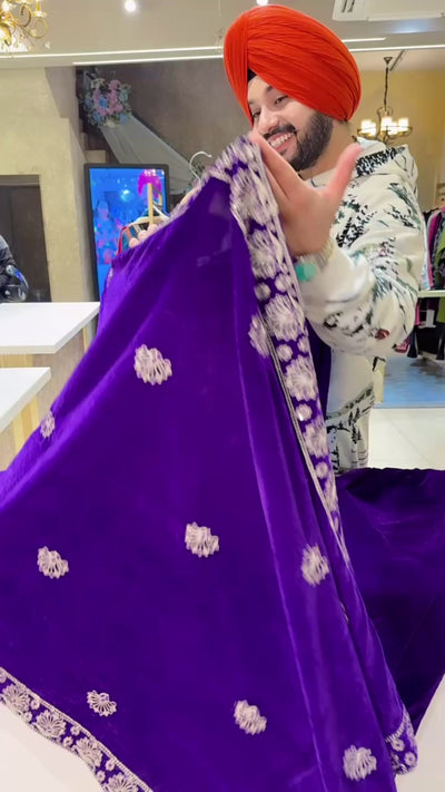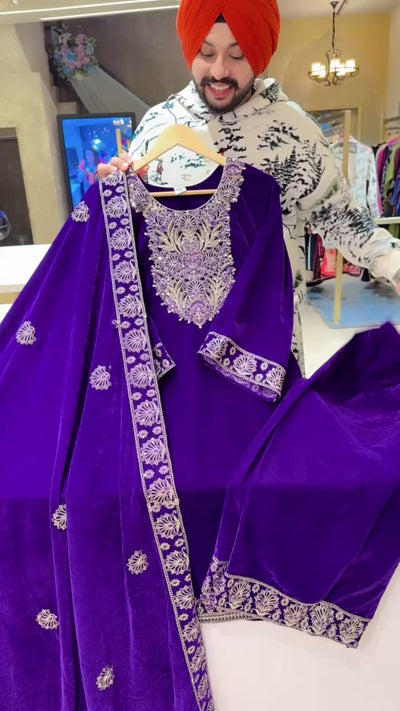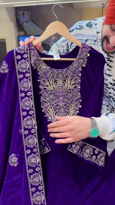 Purple Velvet Heavy Embroidered Party wear Straight Plazo suit with Beautiful Heavy Duppata