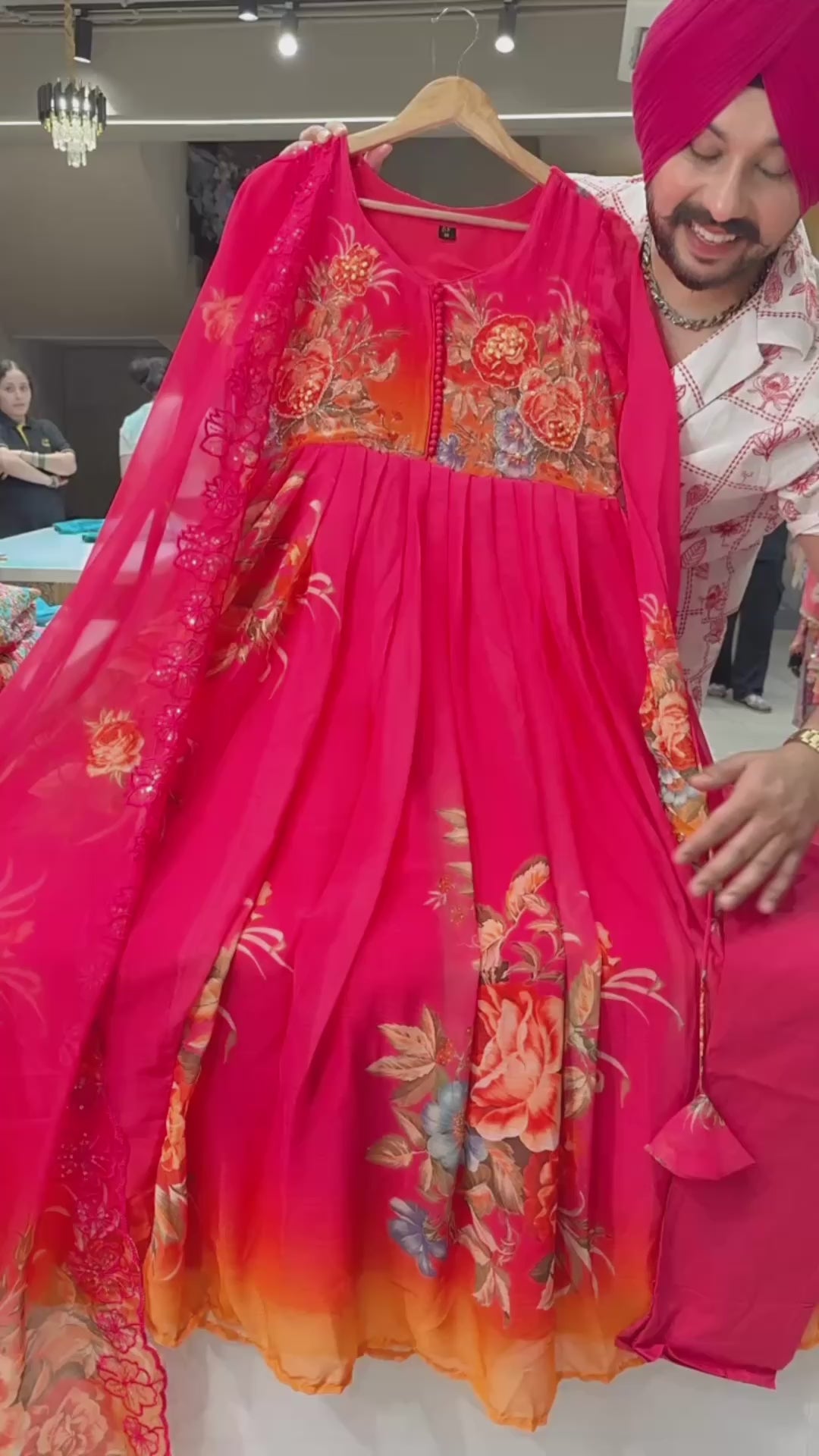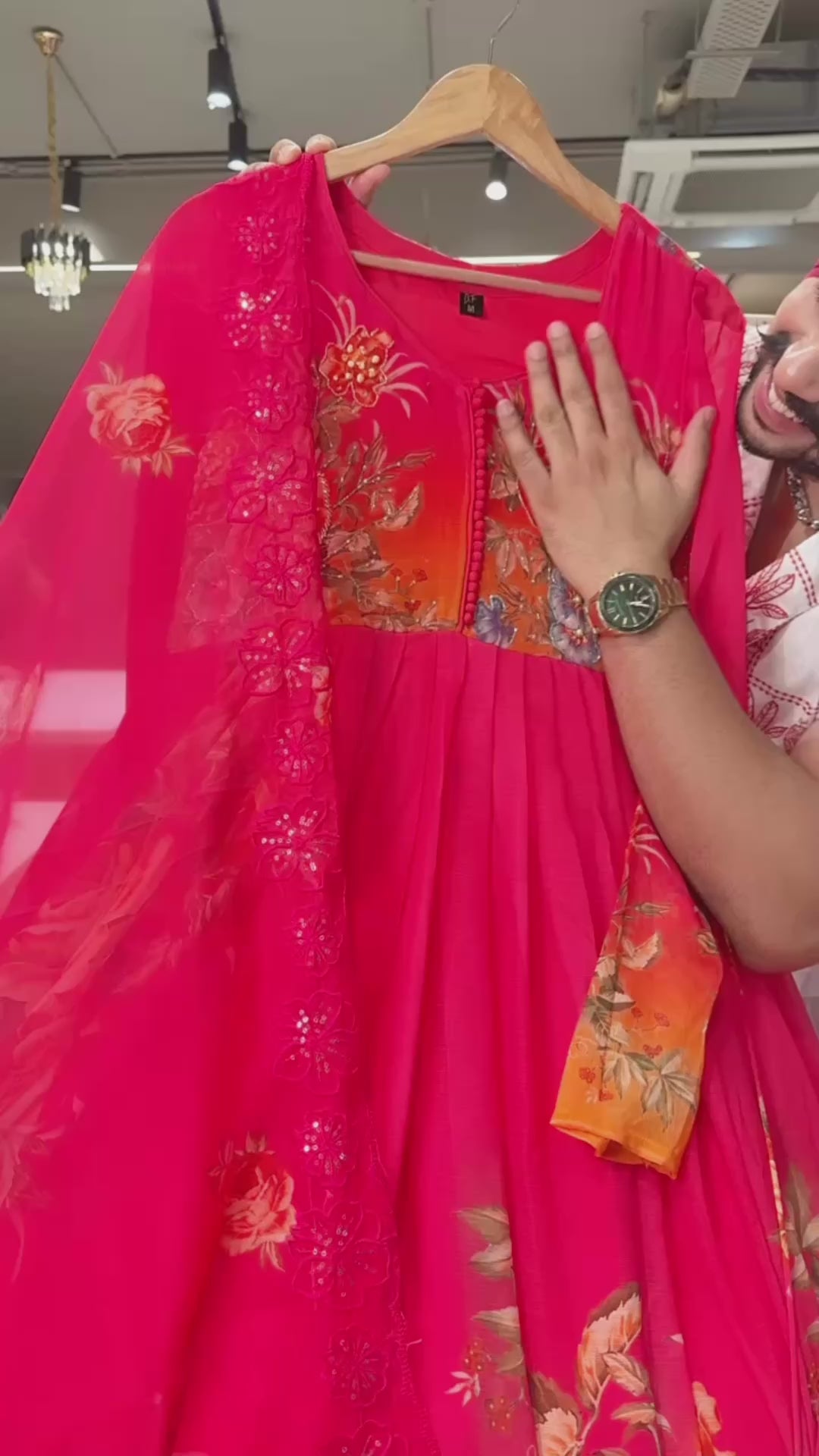 Vibrant Gajri chiffon Floral Print Full Flair Anarkali Suit with Hand embroidery Work on neck & Organza Dupatta