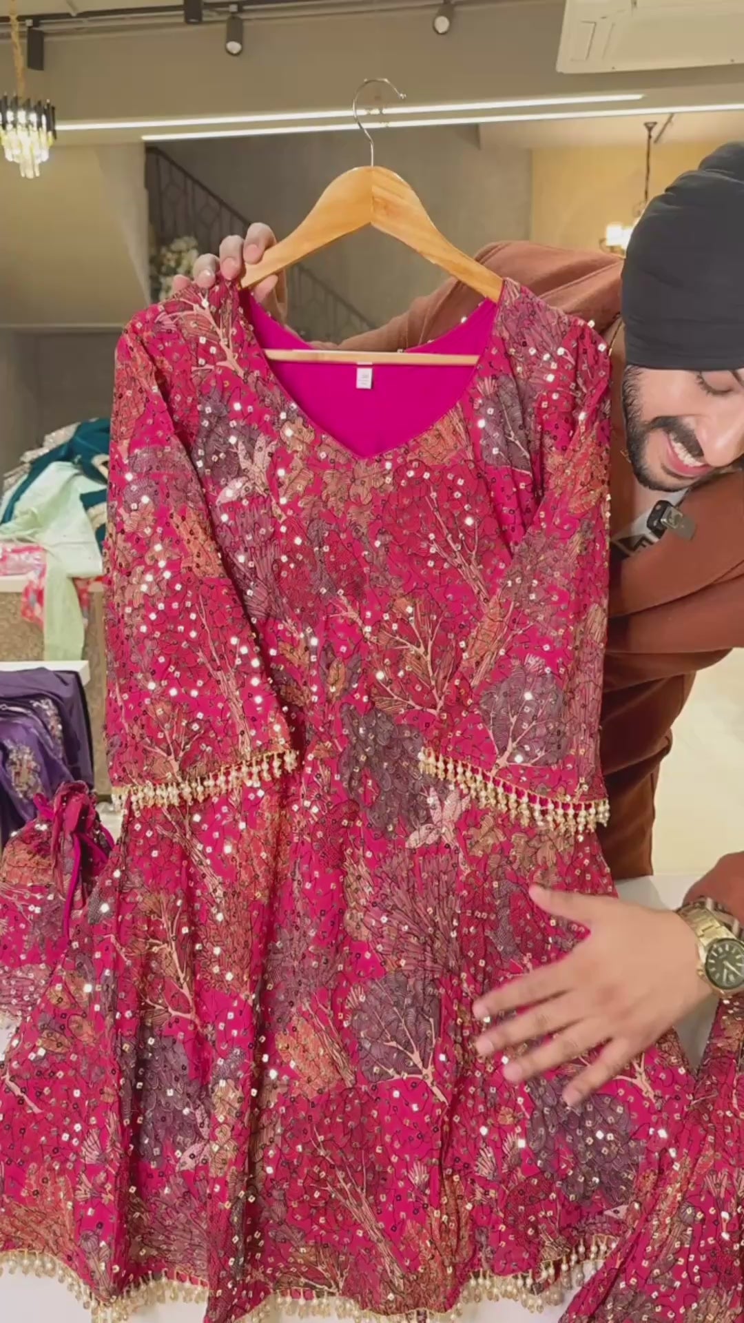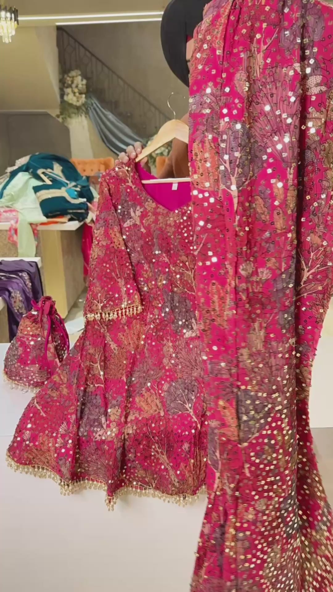 Rani pink Georgette Fully sequence Work Paplum Bell Bottom Coord set with Potli