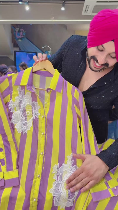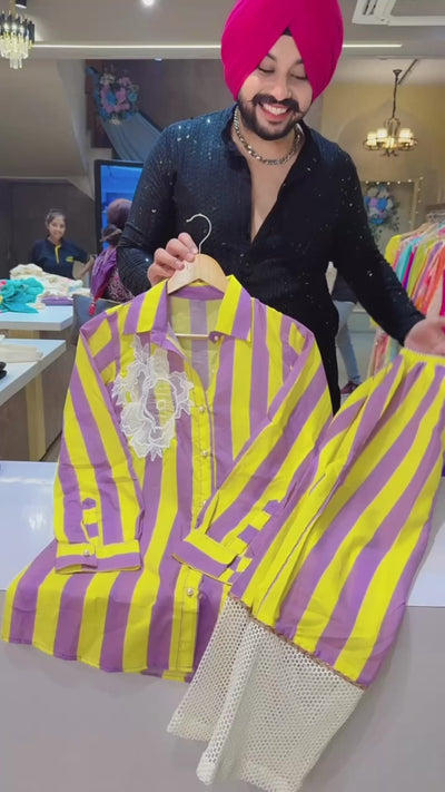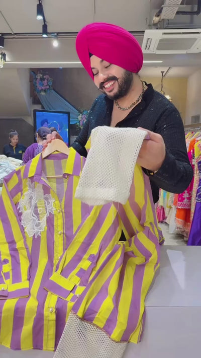 Vibrant Yellow & Purple Soft Cotton Western Coord set with Crochet Net Border on pants
