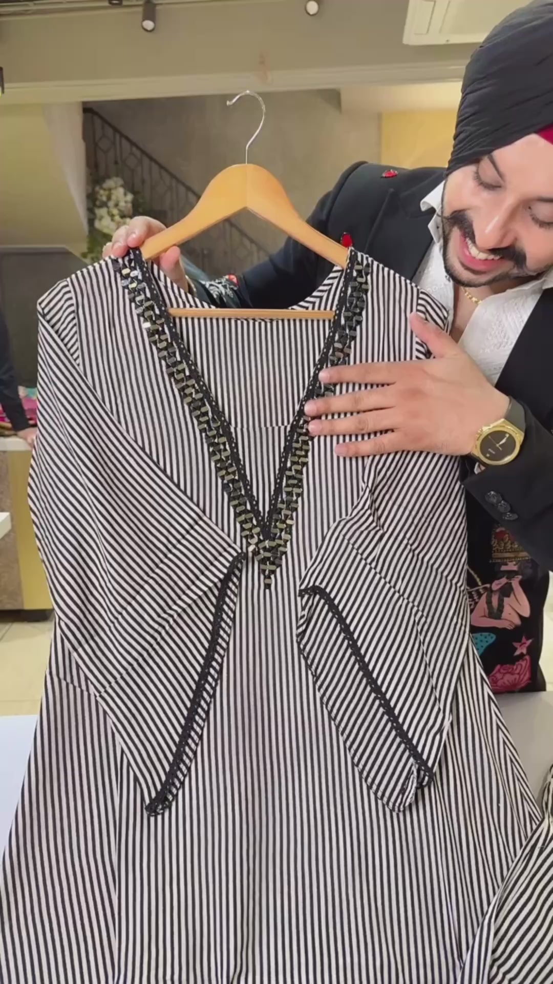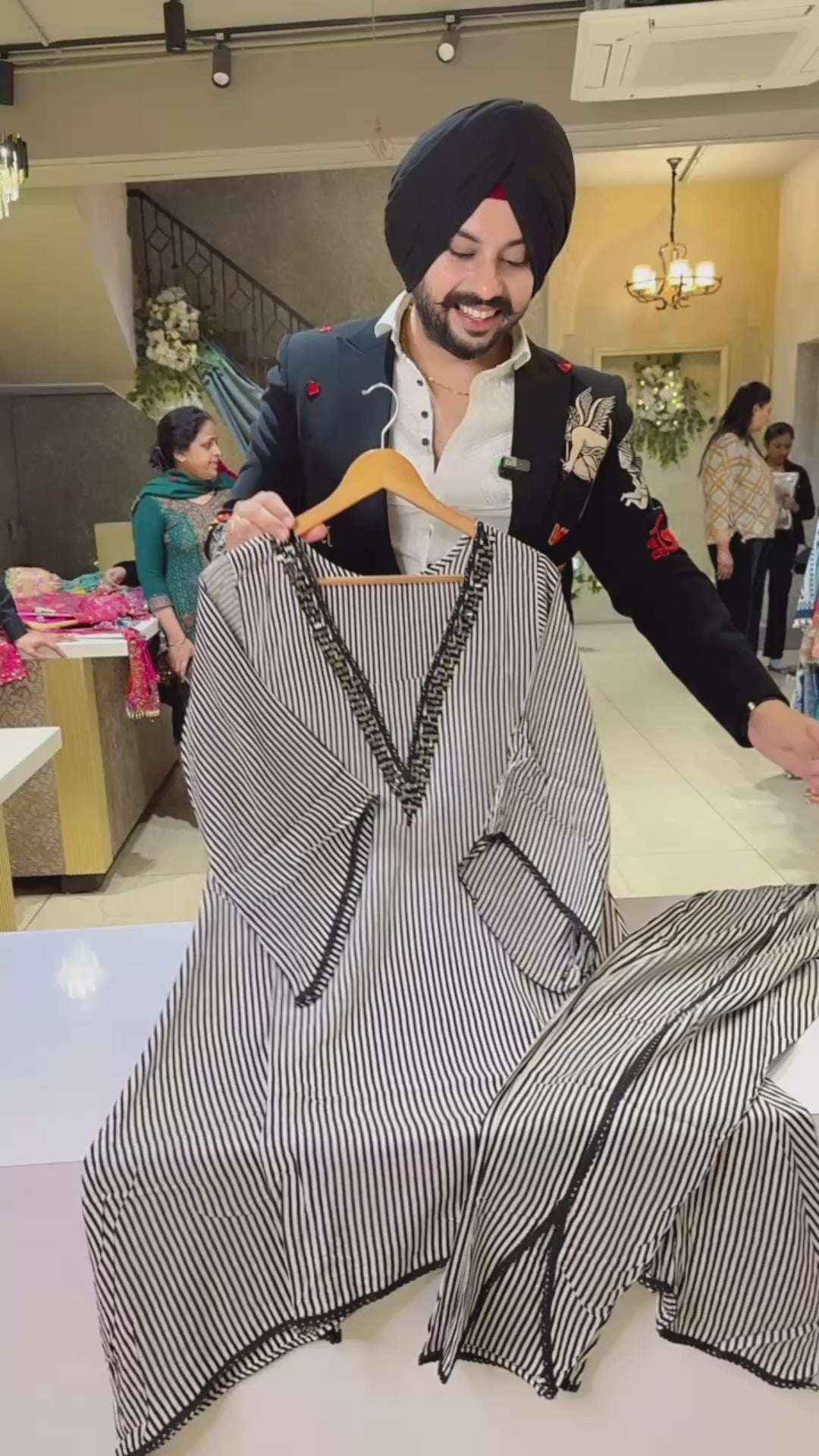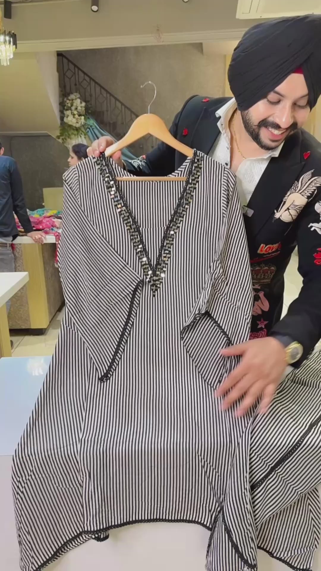 White & Black Premium Rayon Stripped C-Cut Mirror Work Coord set With Stylish Tulip Pants