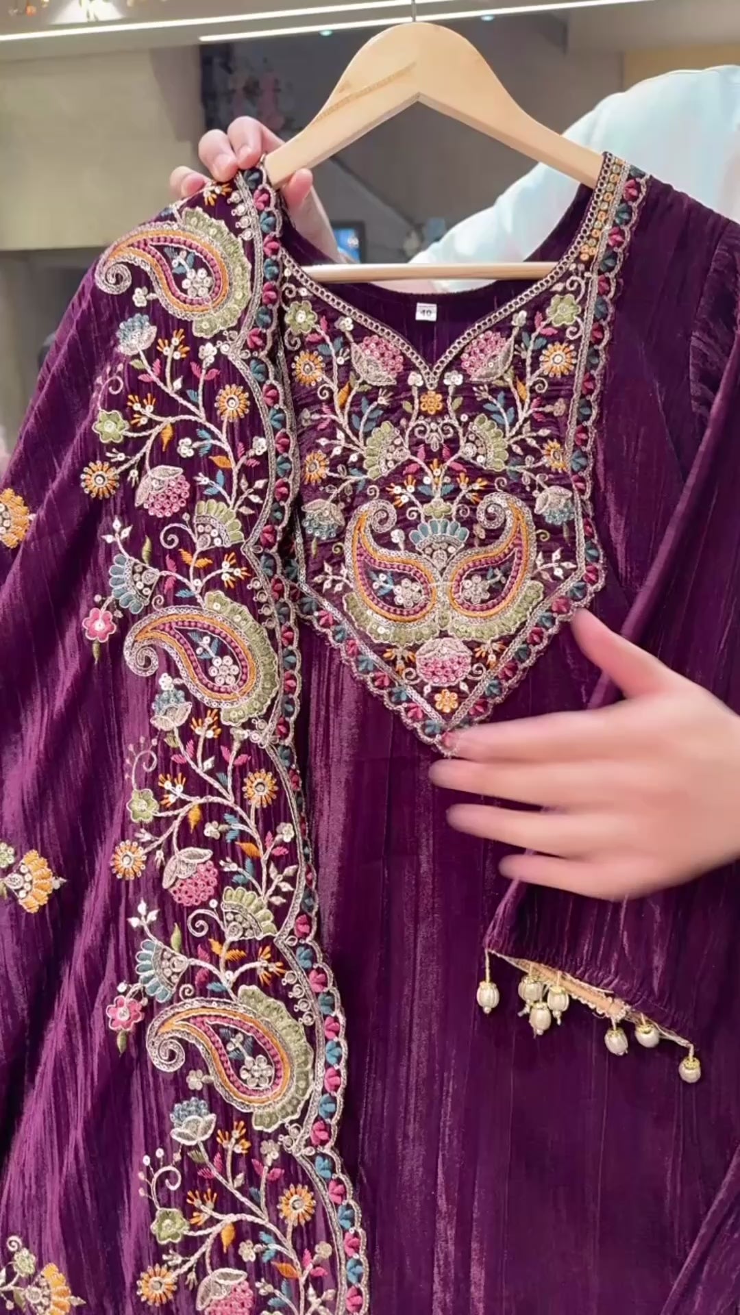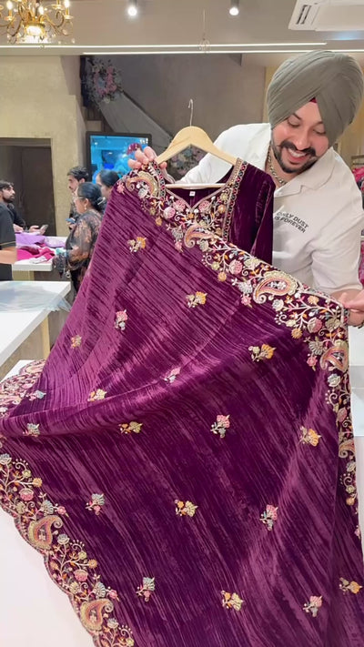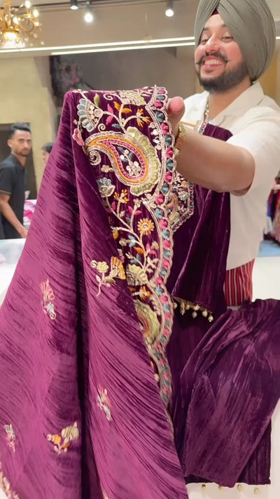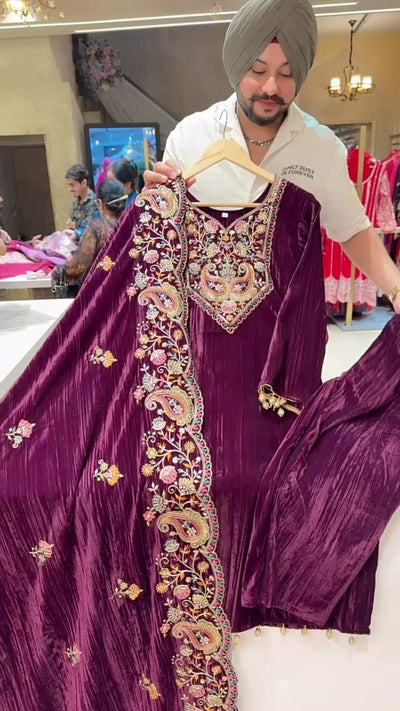Dark Wine Crush Velvet party Wear Suit with Heavy Embroidered Duppata