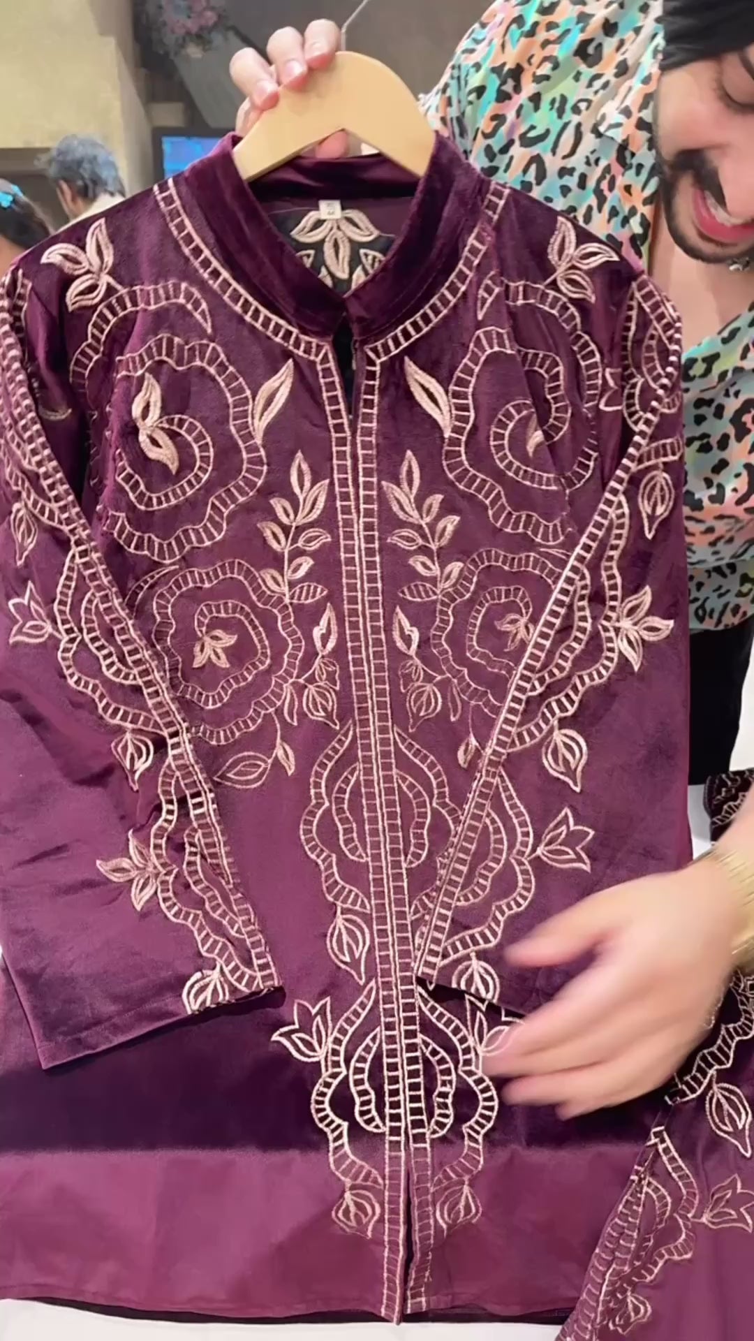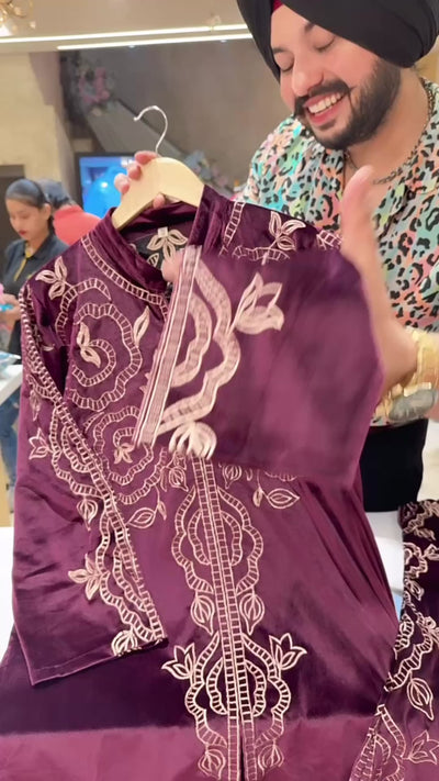Wine Heavy Stretchable Velvet Full Embroidered Party Wear Coord set with Embroidered Pants