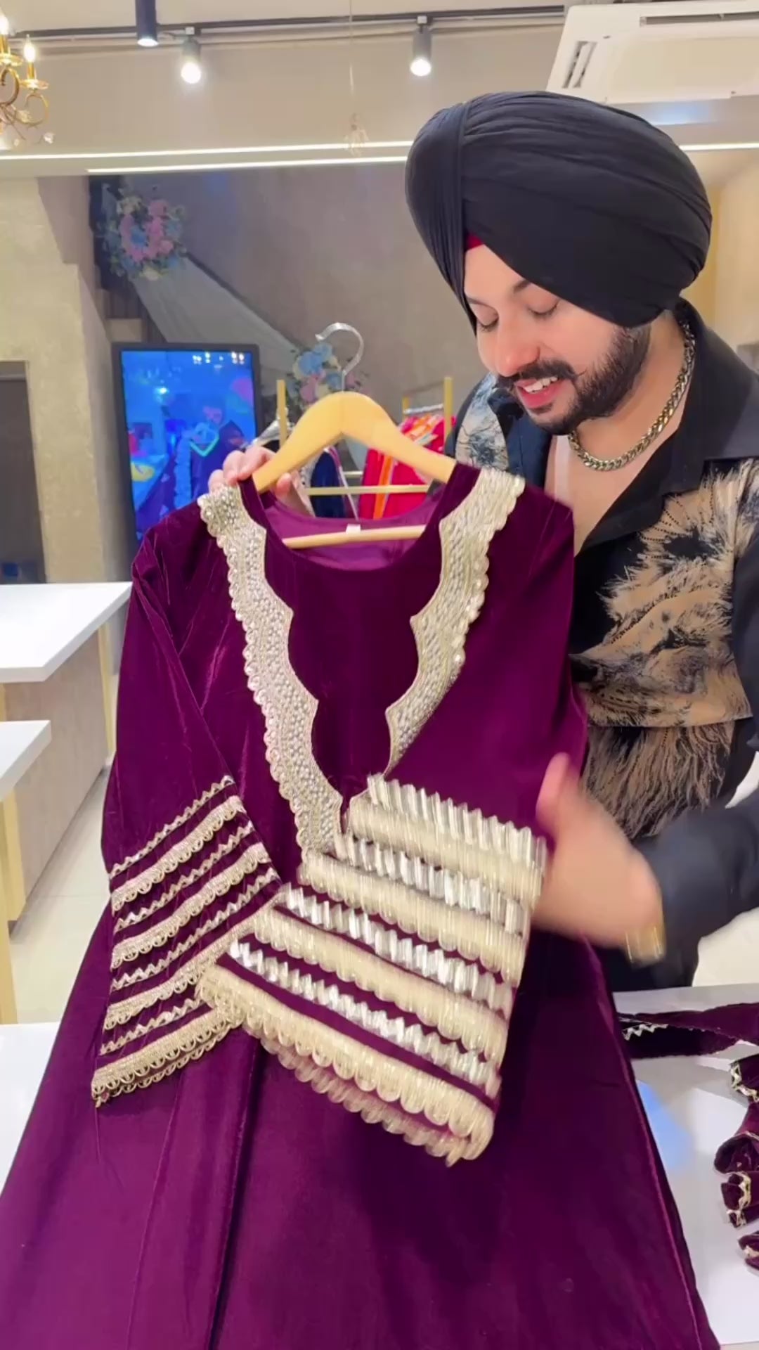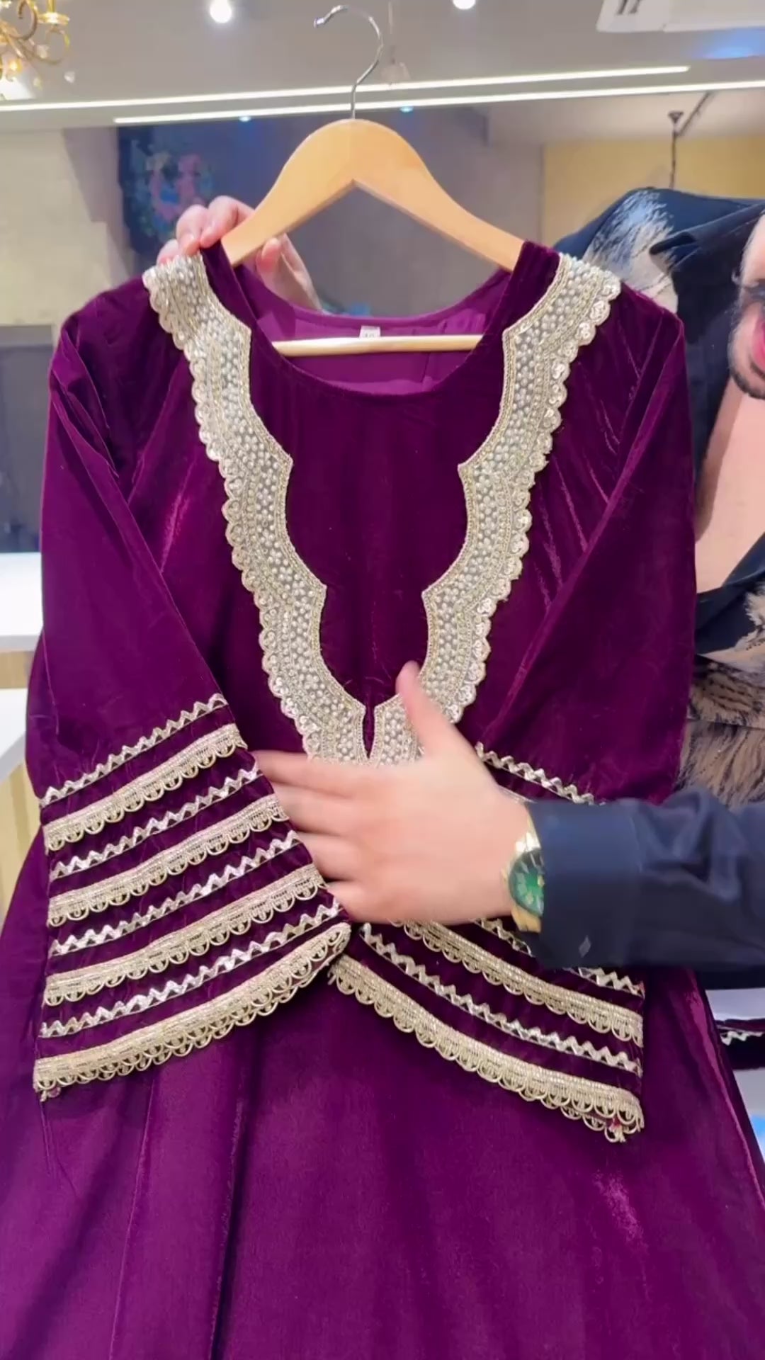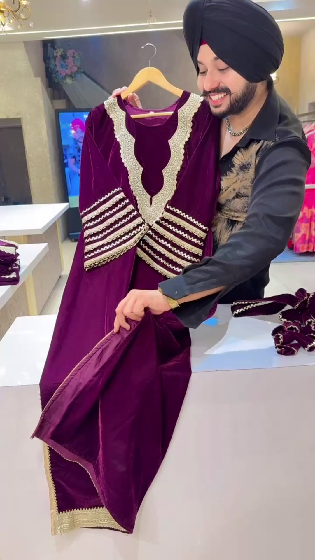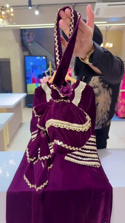 Dark wine Velvet Heavy Embroidered & Gotta Work Straight side Slit One Piece With Cute Potli