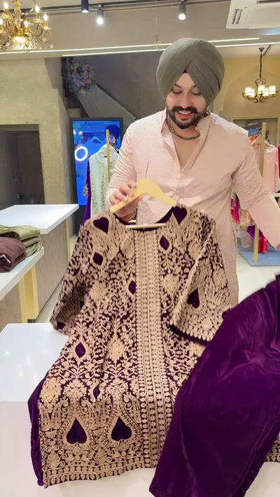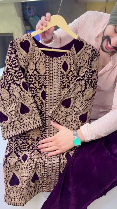 Dark Wine Velvet Heavy Embroidered Party Wear Coord set