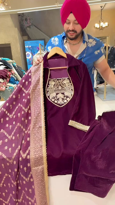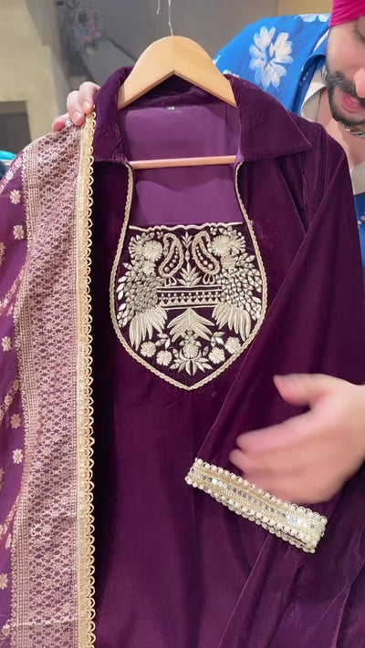 Wine Collar Neck Gotta & Mirror work Party Wear Farshi Salwar Set with beautiful Banarasi Duppata