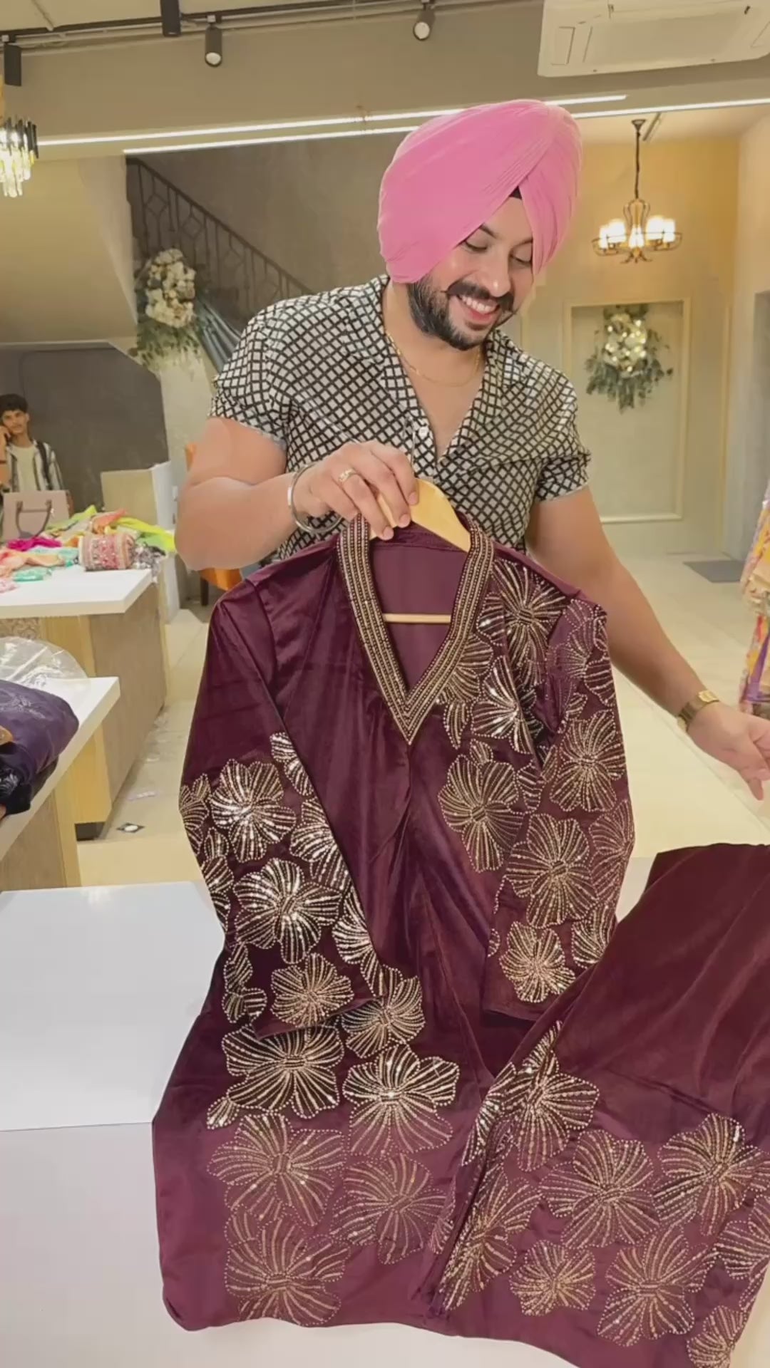 Maroonish wine heavy Sequence Work Strechable velvet Bell bottom Coord set