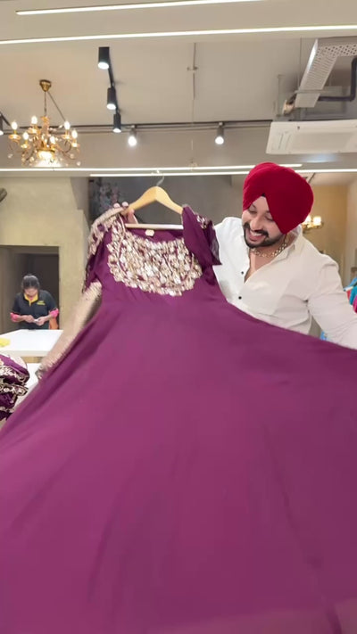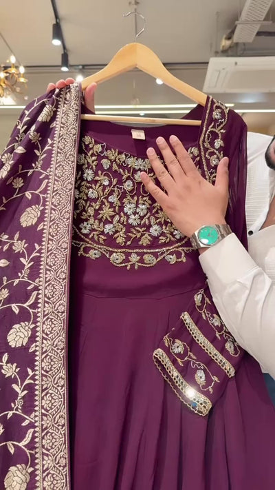 Wine Georgette Party Wear Hand Embroidered Designer Neck Anarkali Gown with Beautiful Banarasi look Duppata
