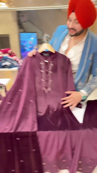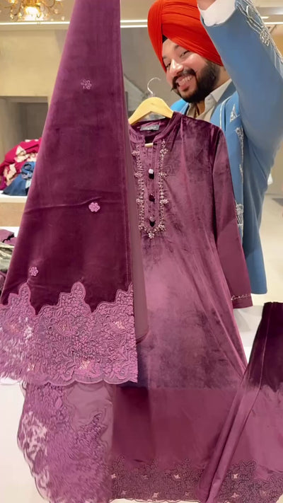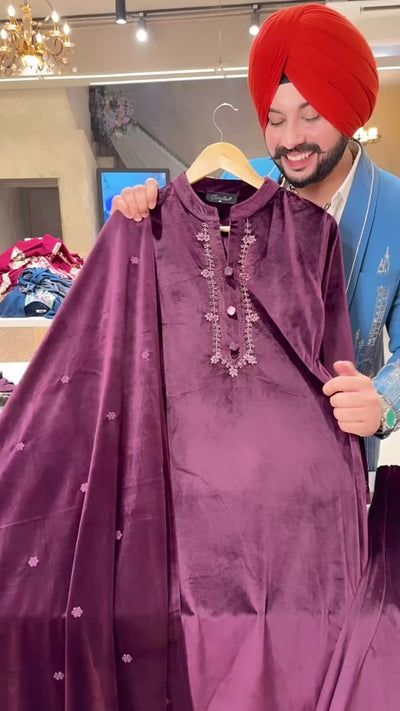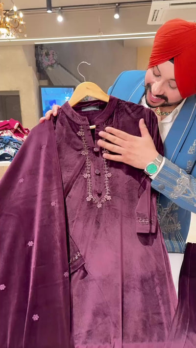 Wine Velvet Hand & Self Embroidered Party Wear Straight Suit