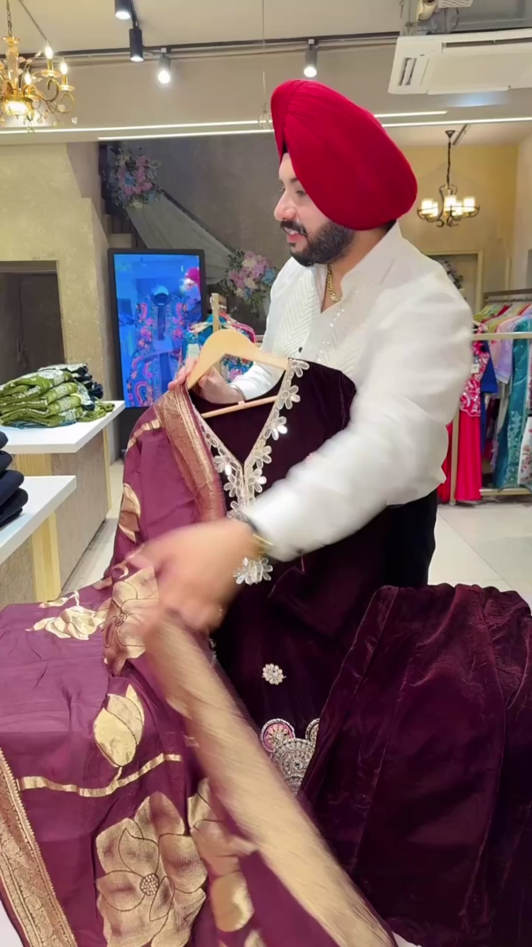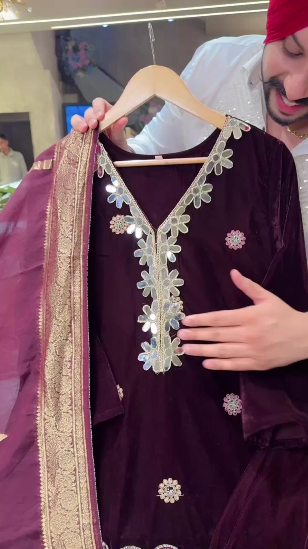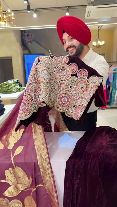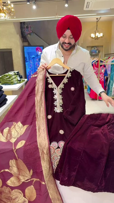Wine Velvet Mirror & Heavy Hand Embroidered Indowestern Suit with Banarasi look Duppata