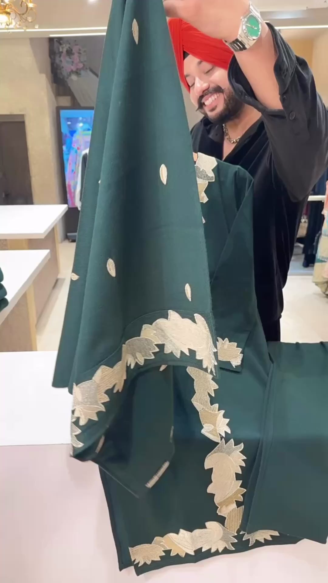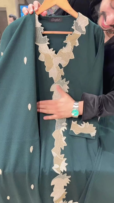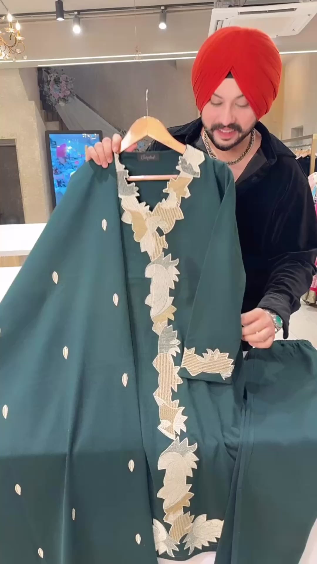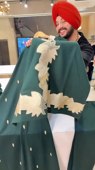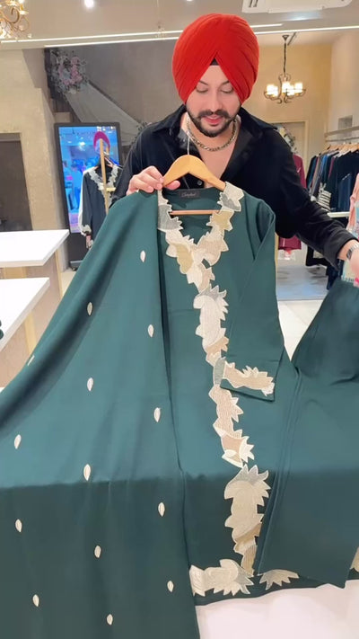 Dark Green Woolen Designer neck Straight Suit with Beautiful Embroidery work On It