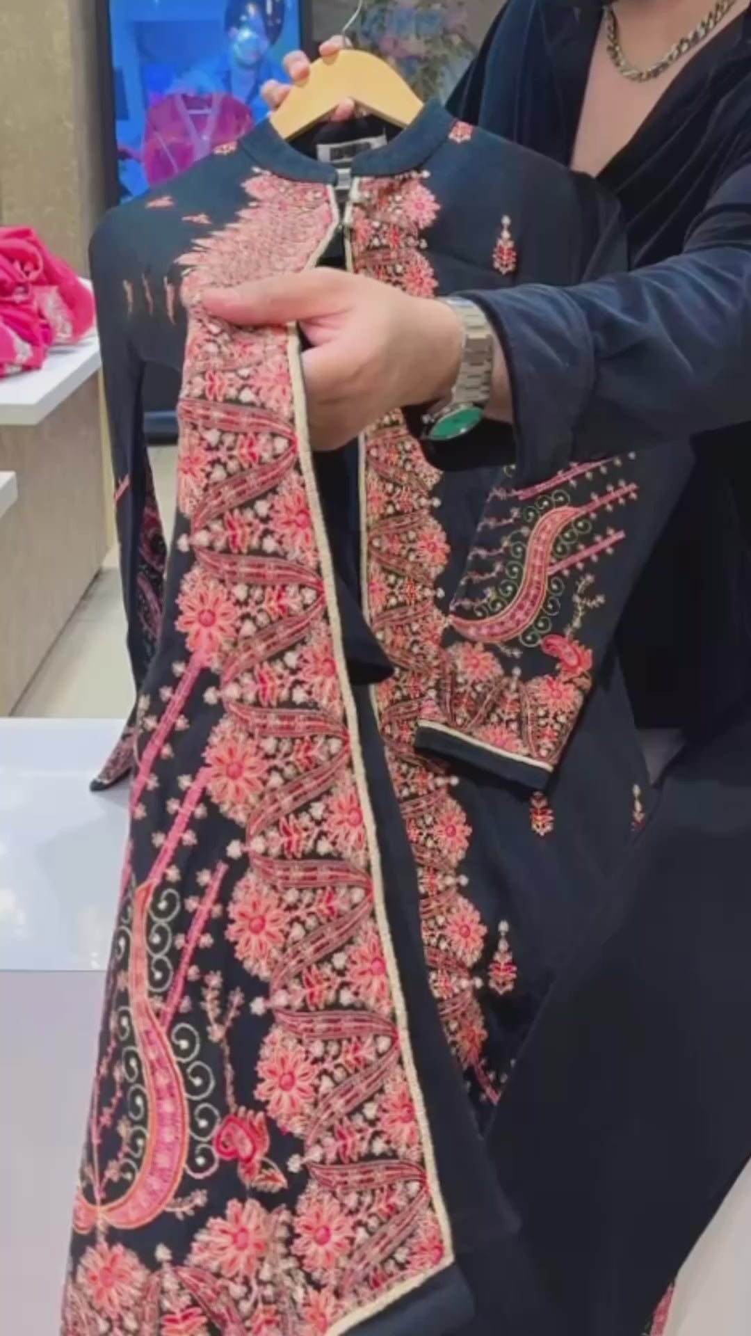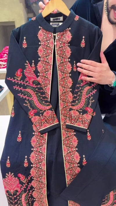 Black Woolen Long length Coord set With Heavy Kashmiri Embroidered Shrug