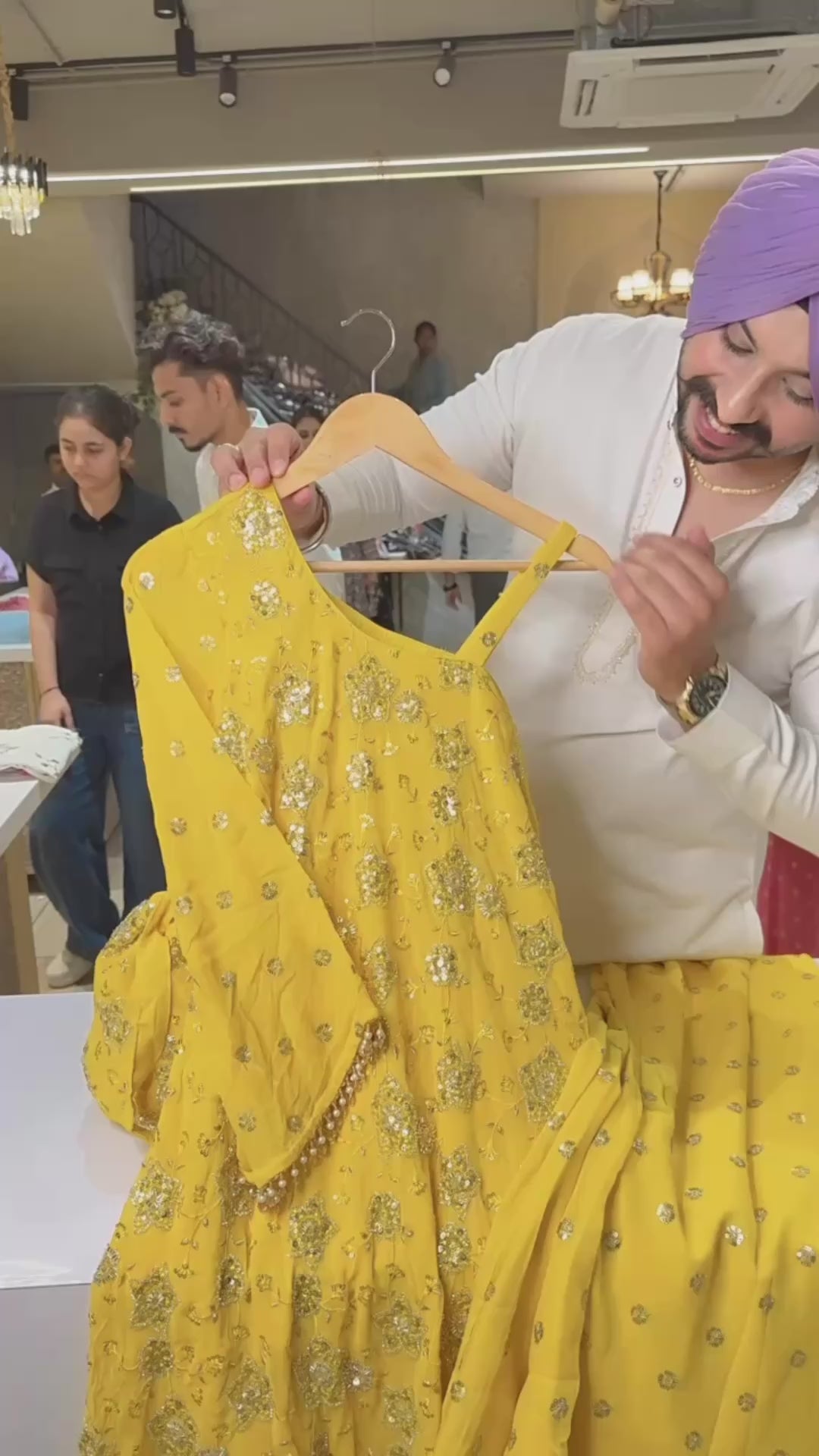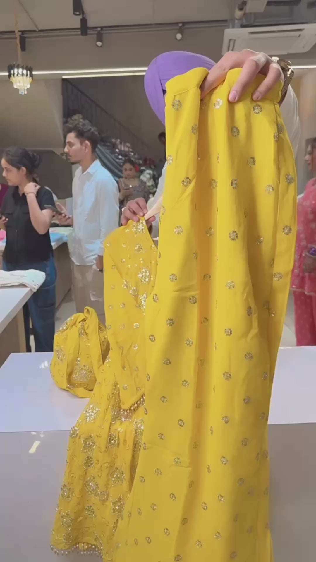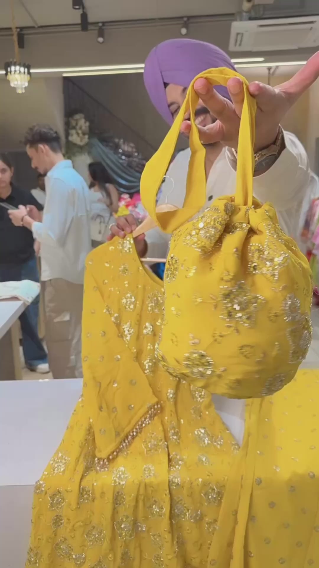 Yellow heavy Hand embroidered Off shoulder Paplum Bell Bottom Coord set with Cute Potli