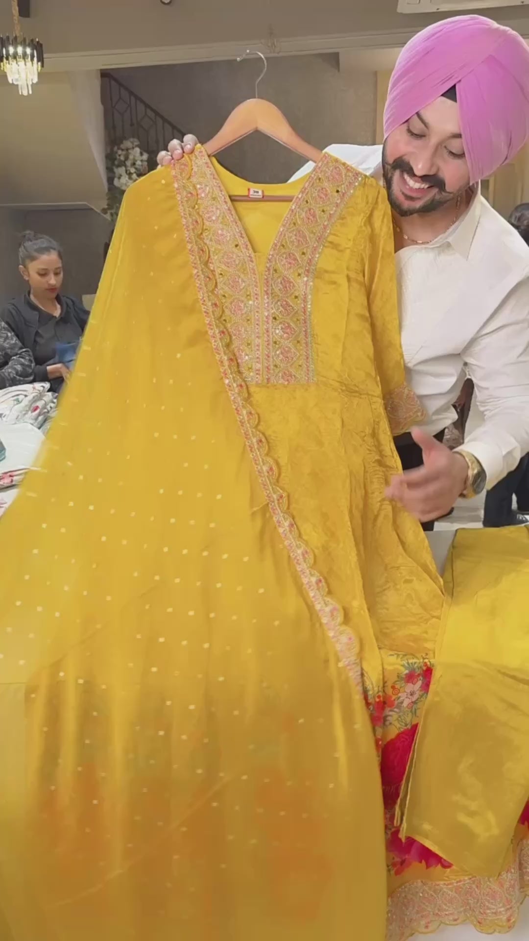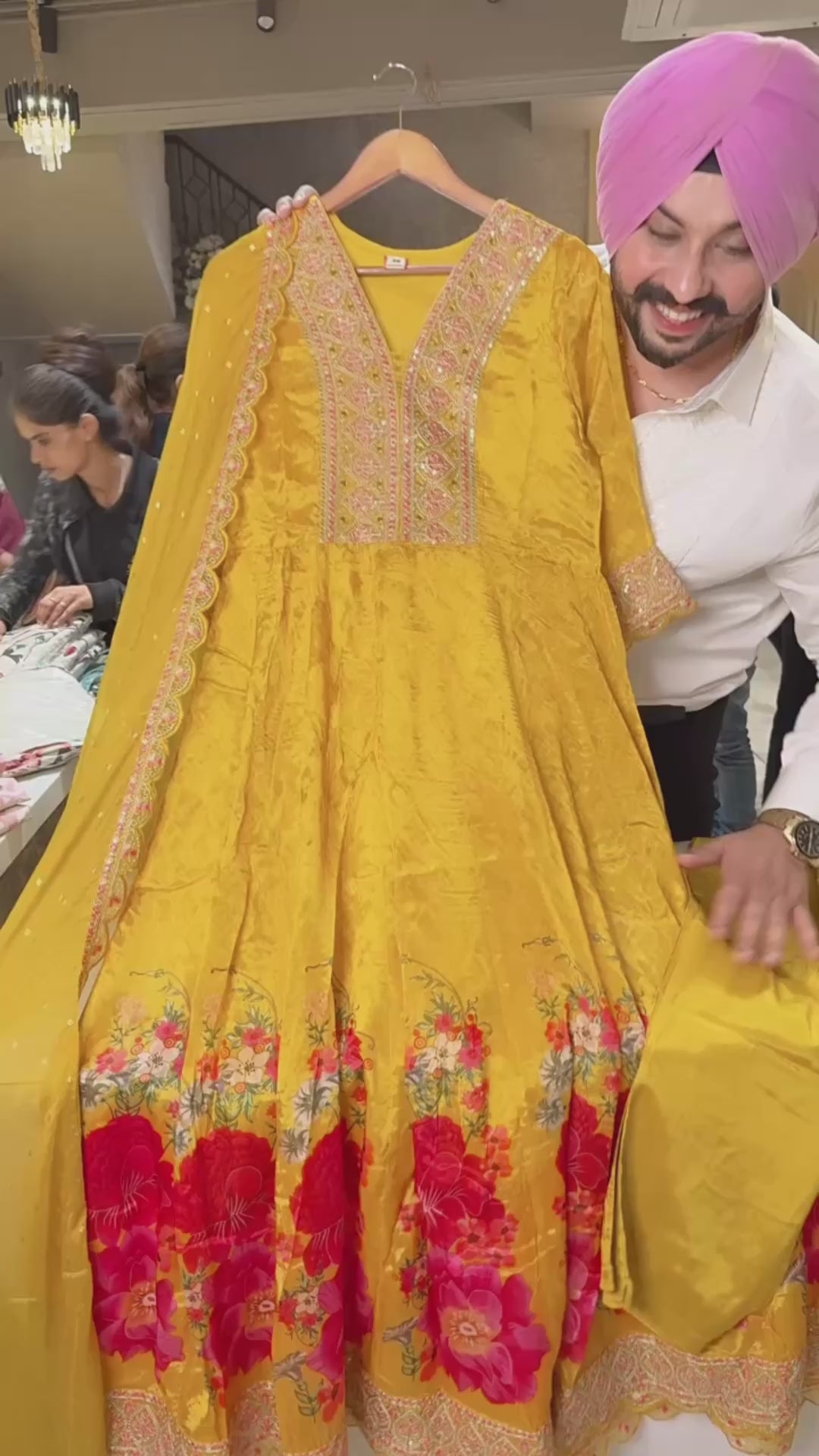 Yellow Chinon Floral Print Full Flair embroidered Full Flair Anarkali suit with beautiful Duppata