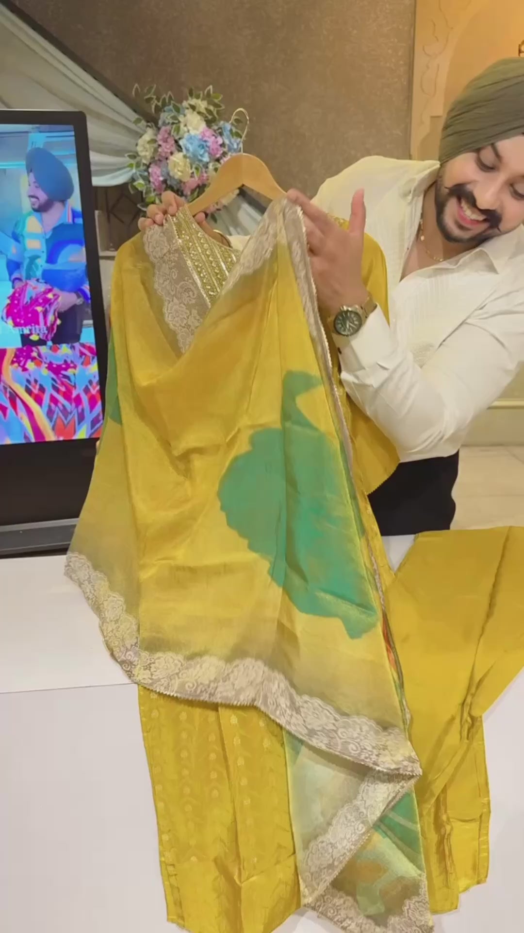 Goldenish Yellow Shimmer Soft Organza Embroidered Straight Suit with Silk Duppata