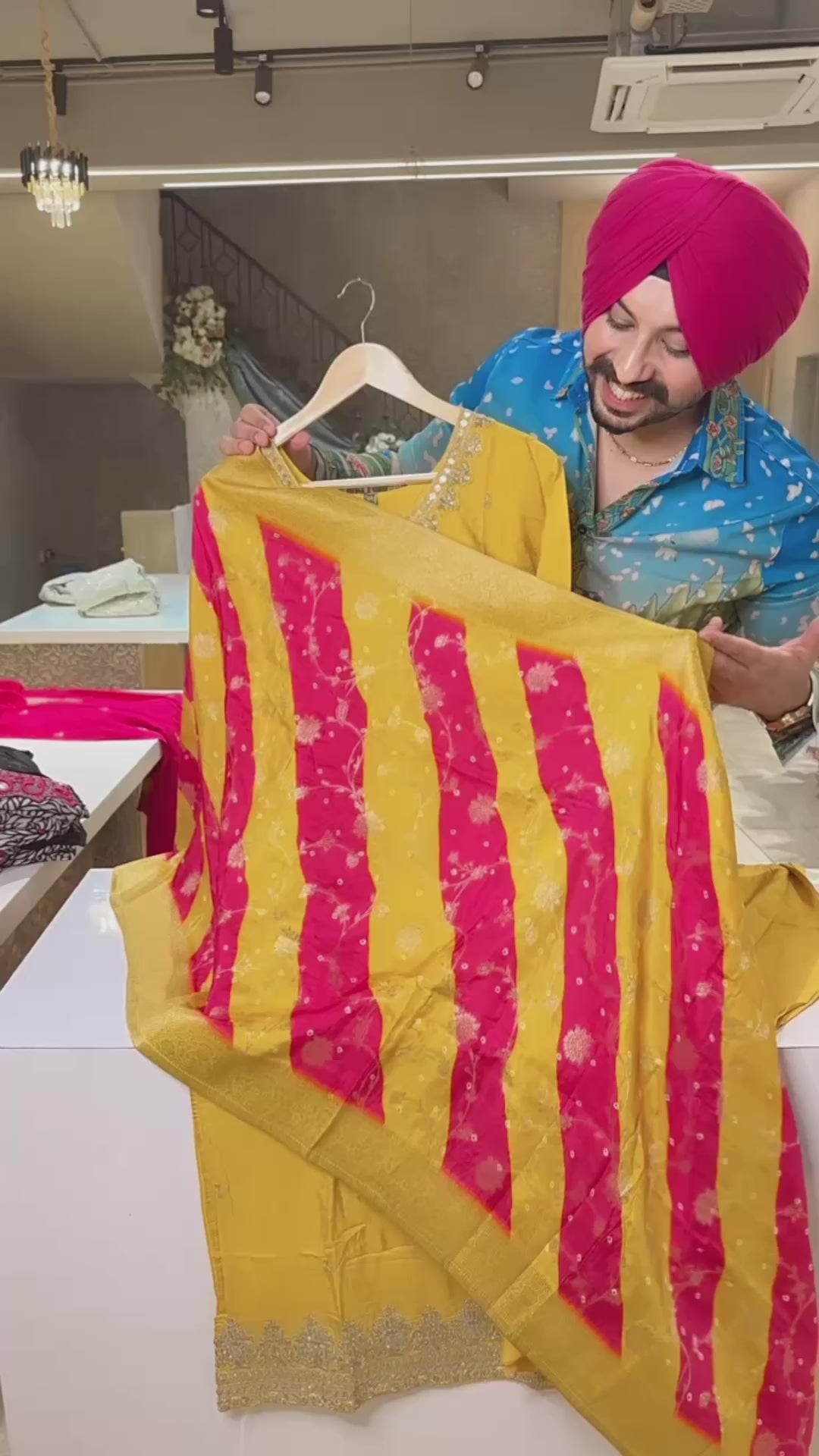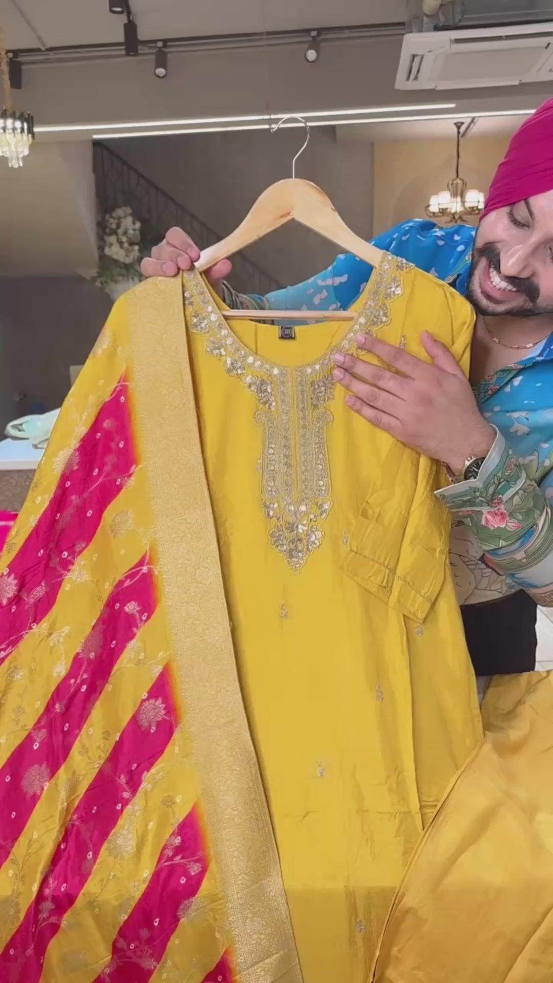 Yellow Muslin silk embroidered Straight Suit with Banarasi Lehriya Duppata