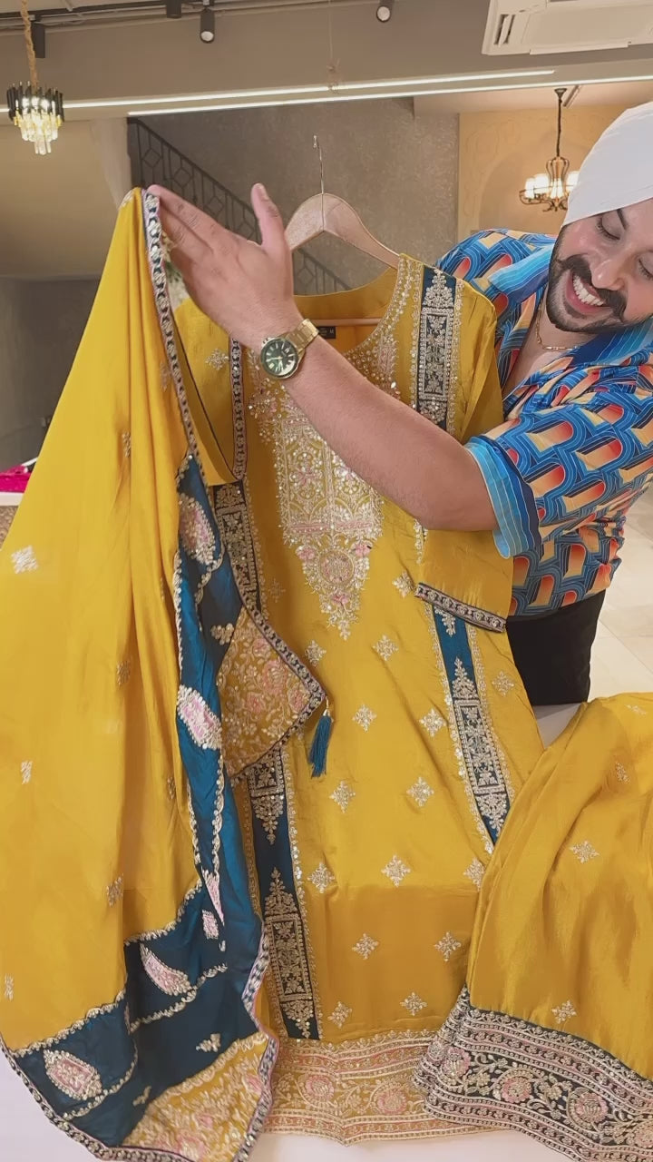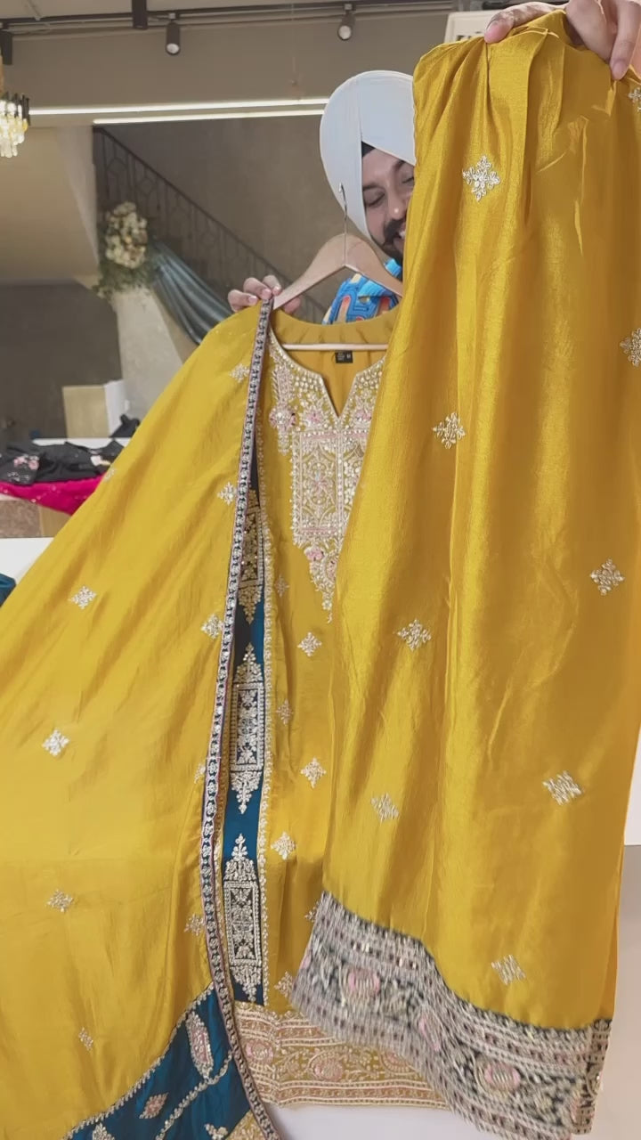 Goldenish yellow chinon Heavy embroidered Premium Plazo suit with Heavy Duppata