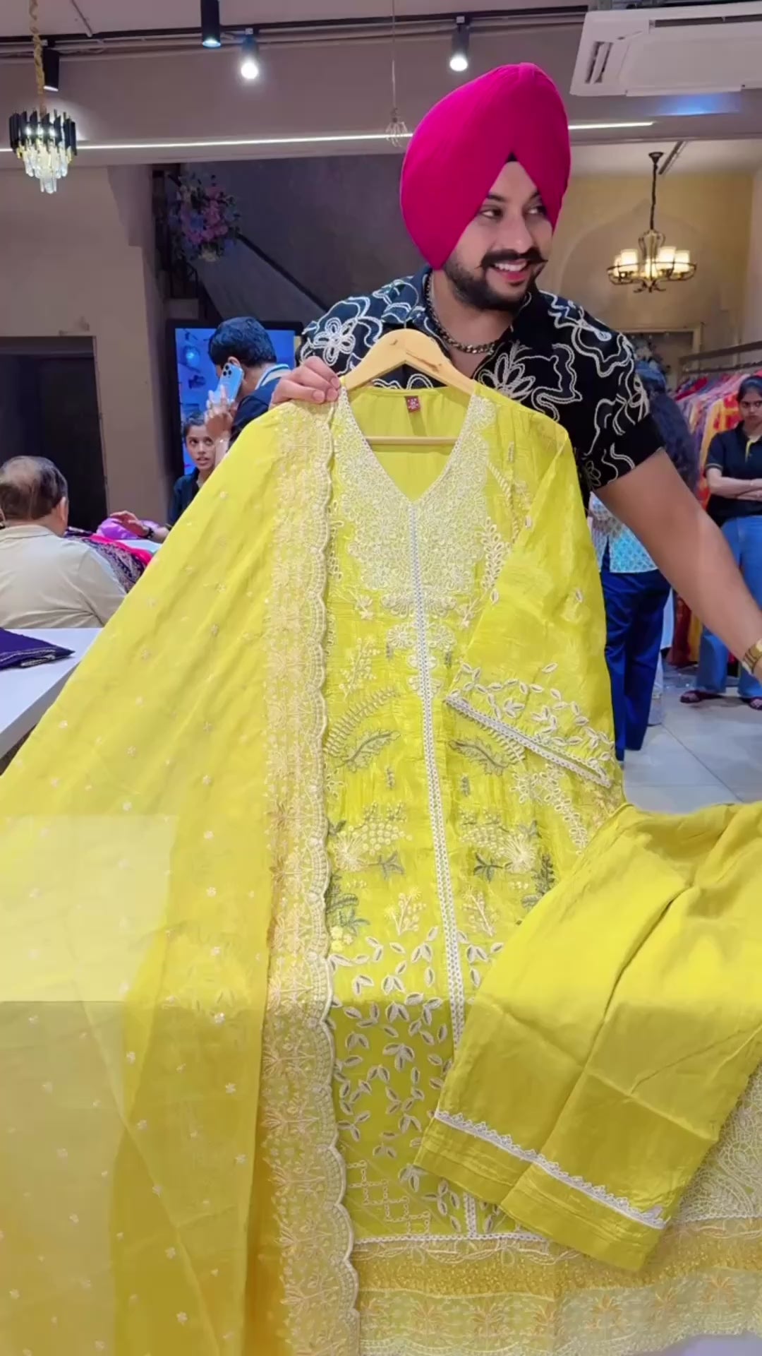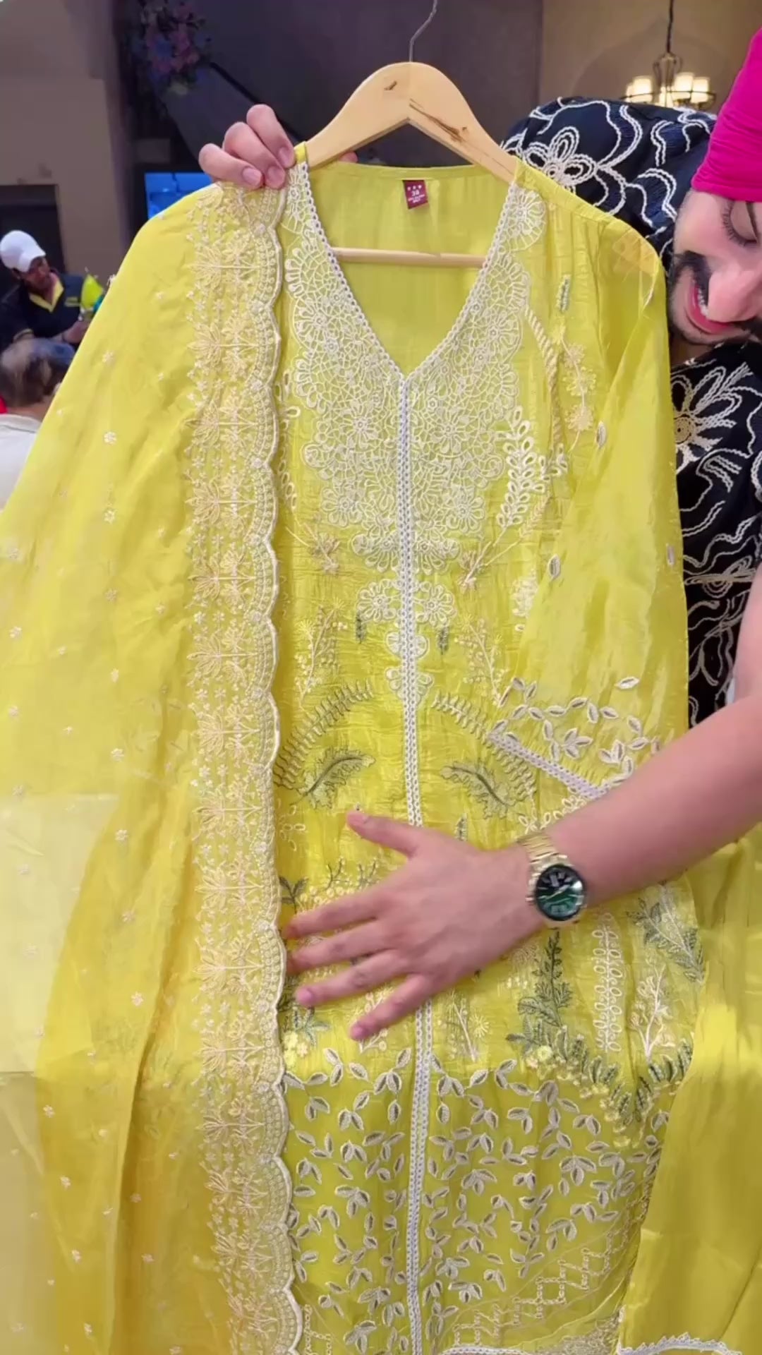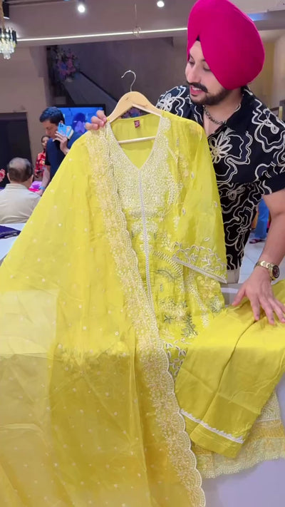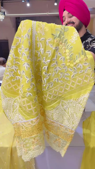 Lemon Yellow Crush Shimmer Organza Heavy embroidered Kashmiri Suit with Beautiful Sequins Work Organza Duppata