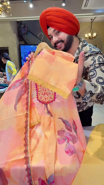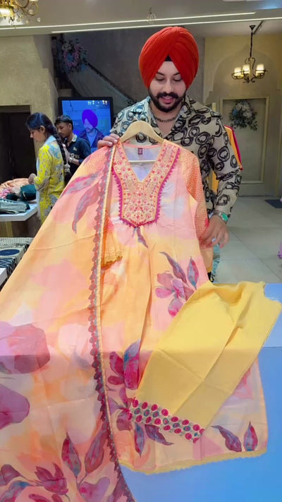 Yellow & Multicolored Embroidered A-line side Slit Suit with Beautiful Kota Doria Duppata