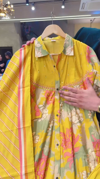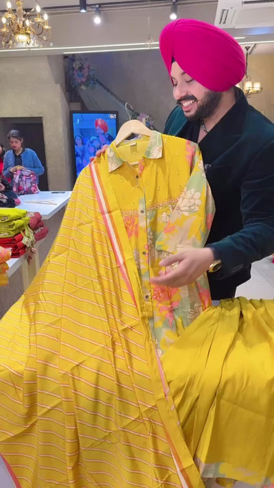 Yellow Muslin Silk Floral Print Collar Neck embroidered A-line Sharara suit
