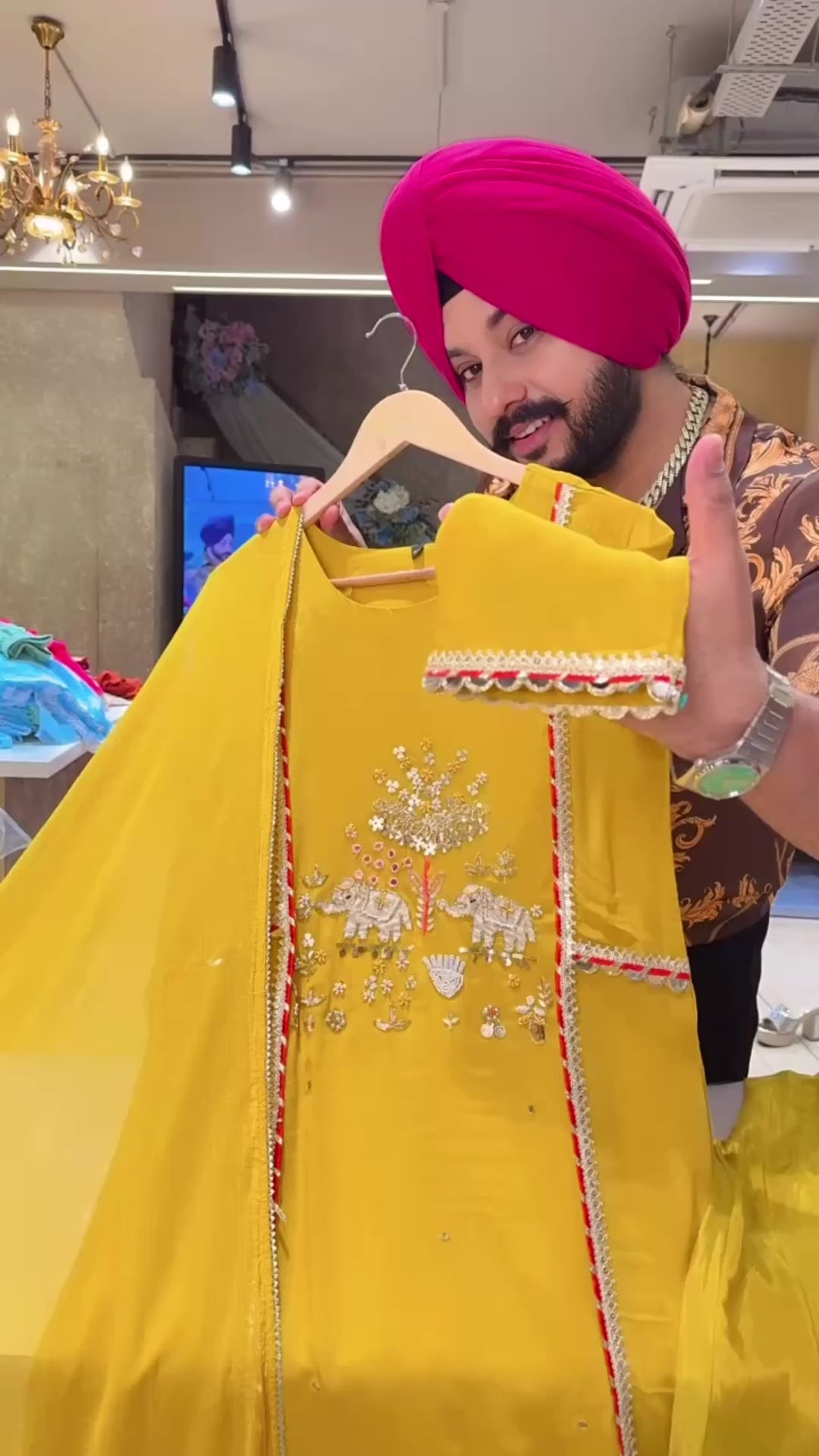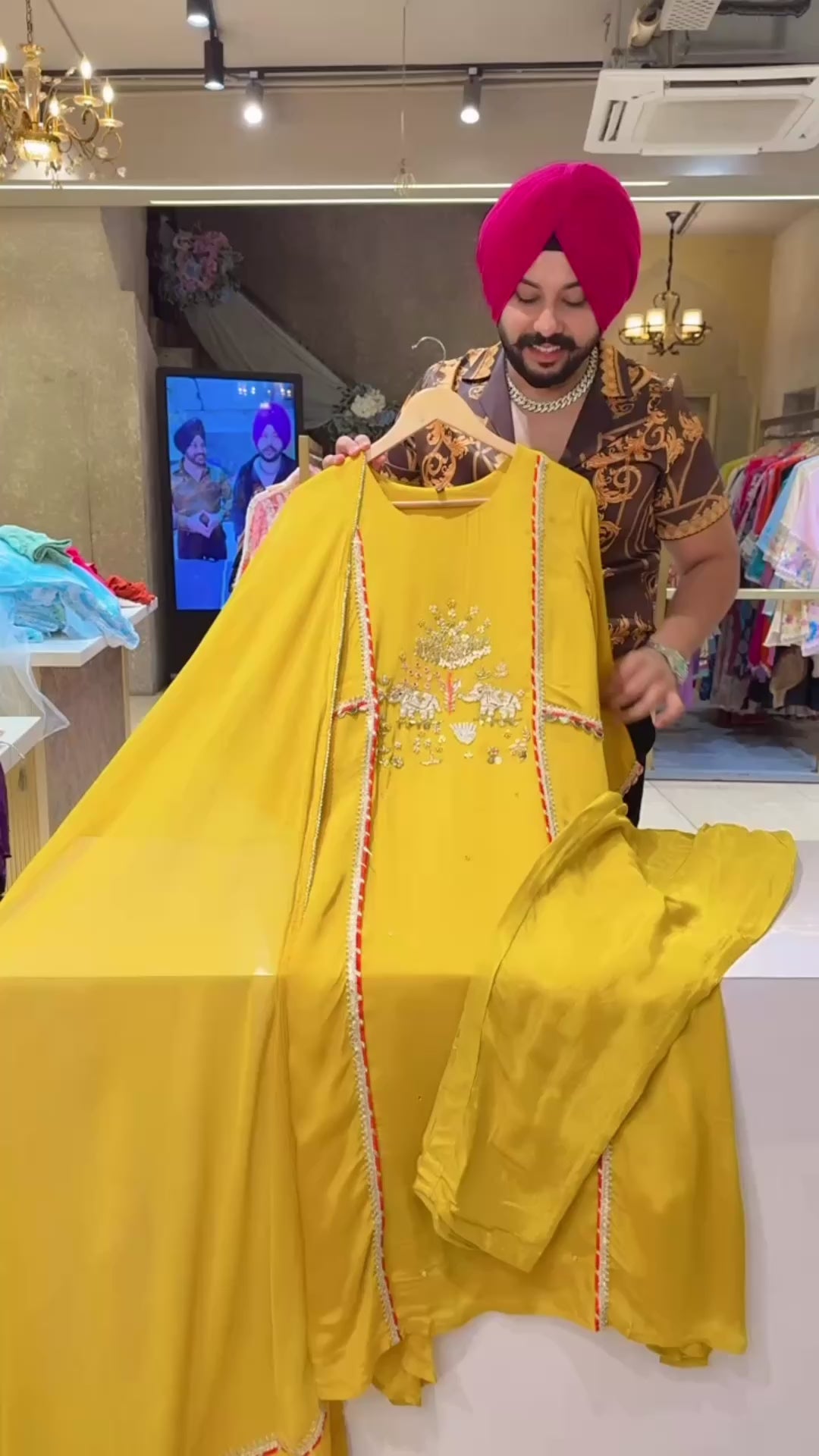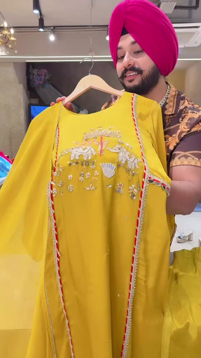 Yellow Premium Chinon Beautiful Elephant Hand embroidered A-line Party wear suit