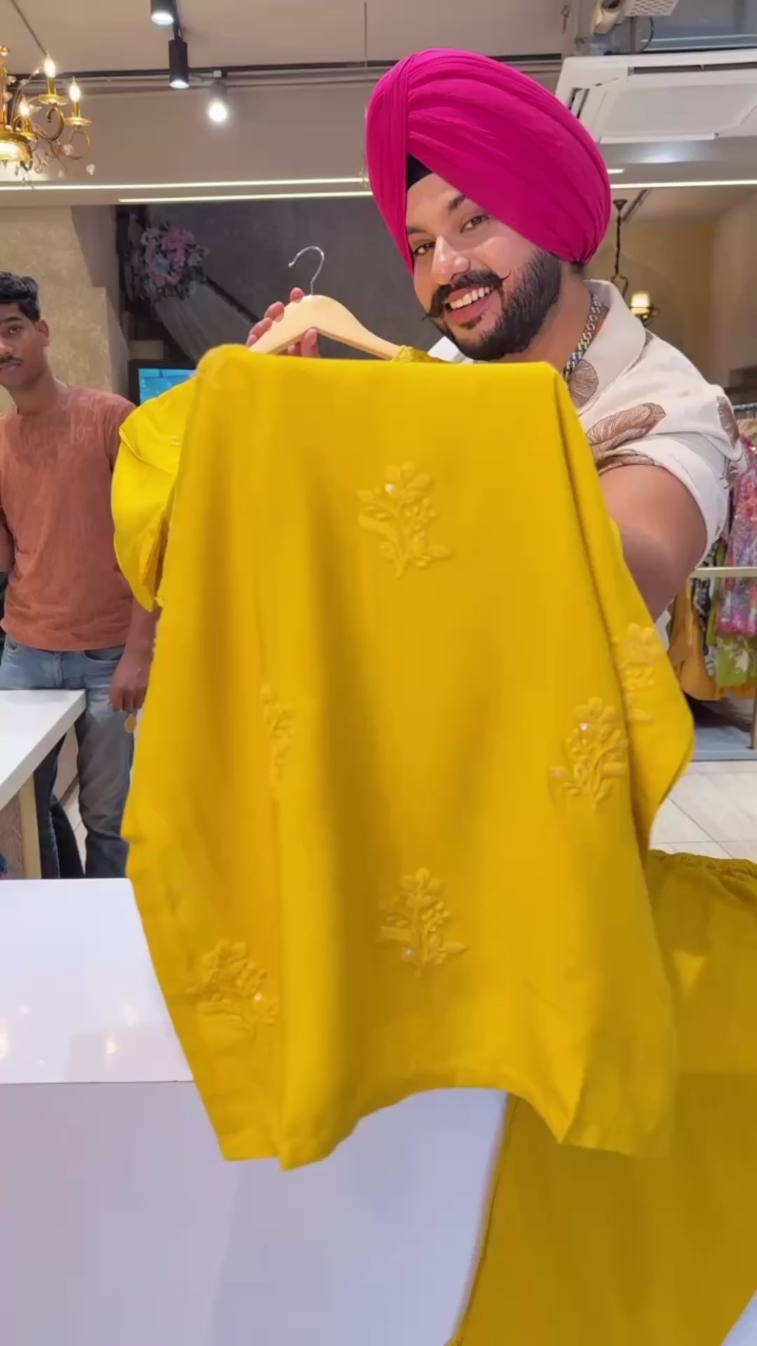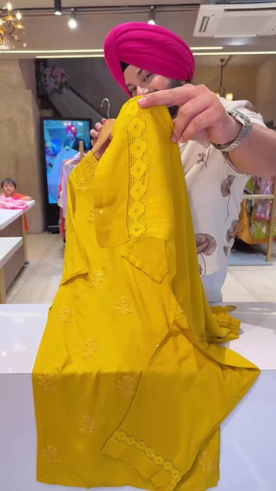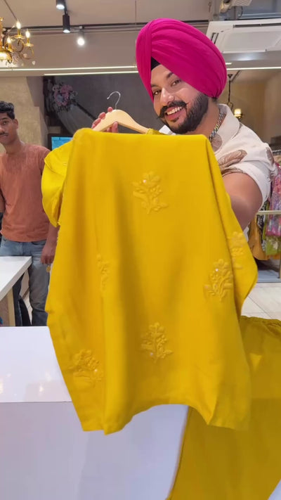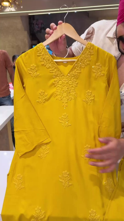 Yellow Soft Rayon Self Lucknowi Style Embroidered Long Length Coord set